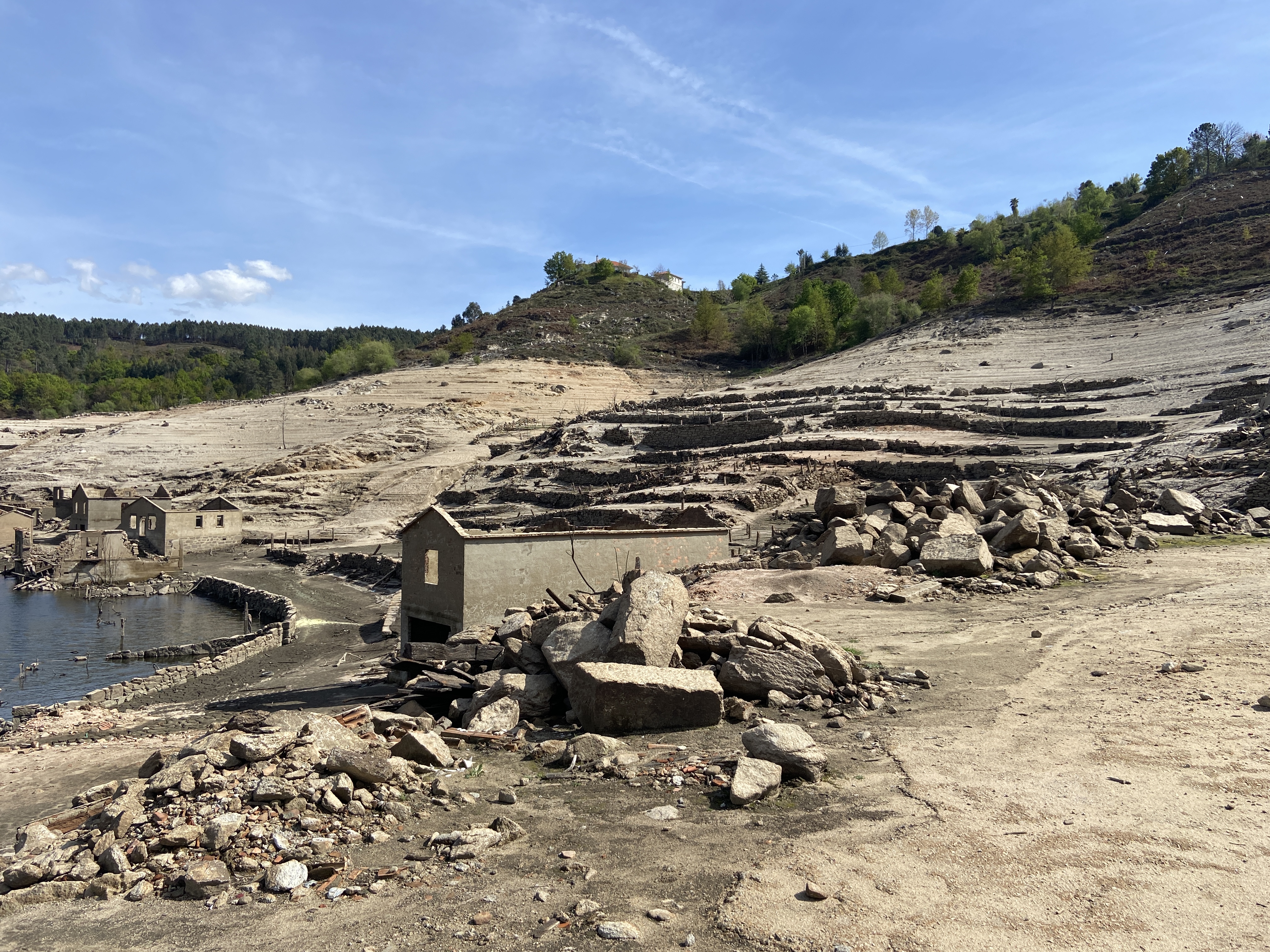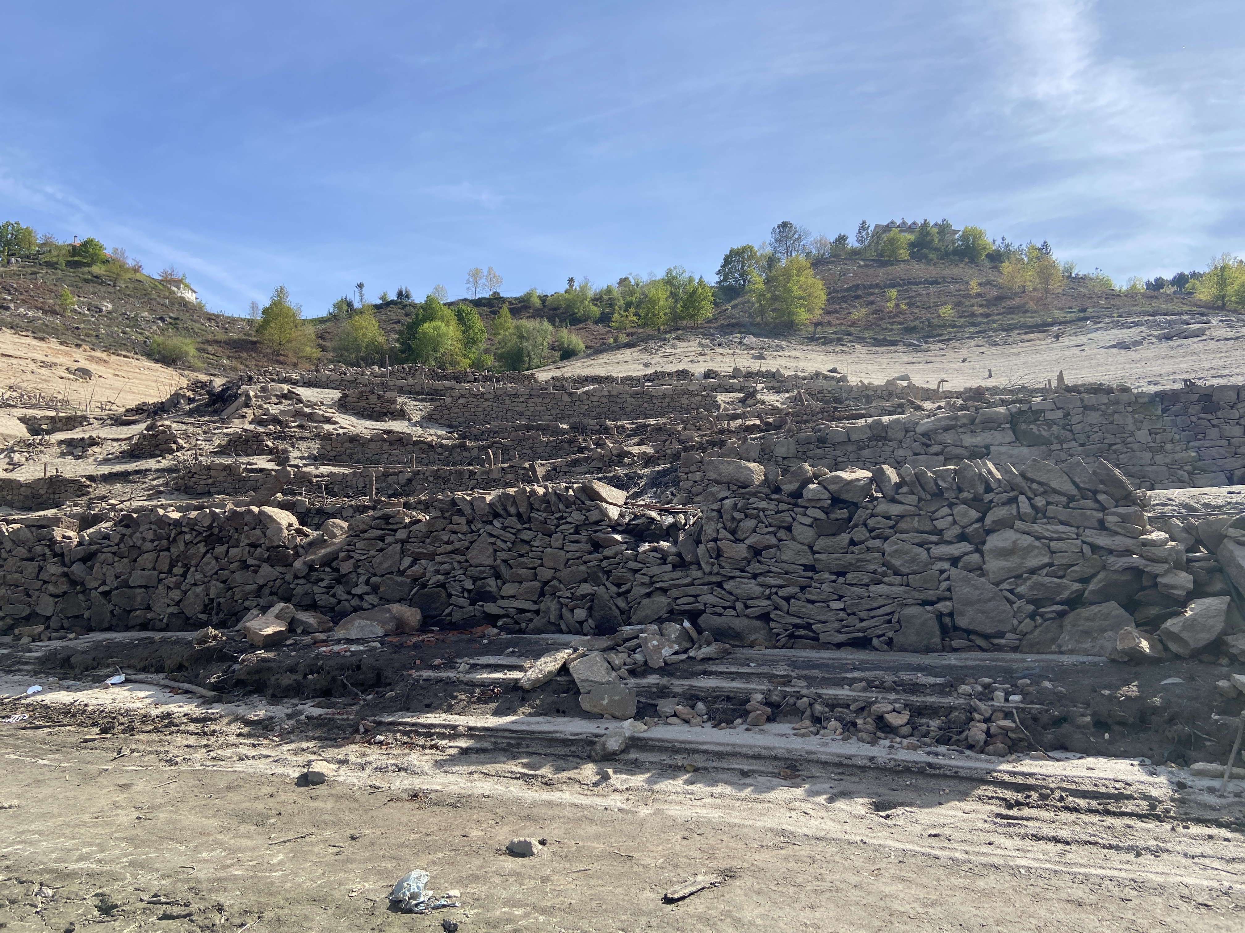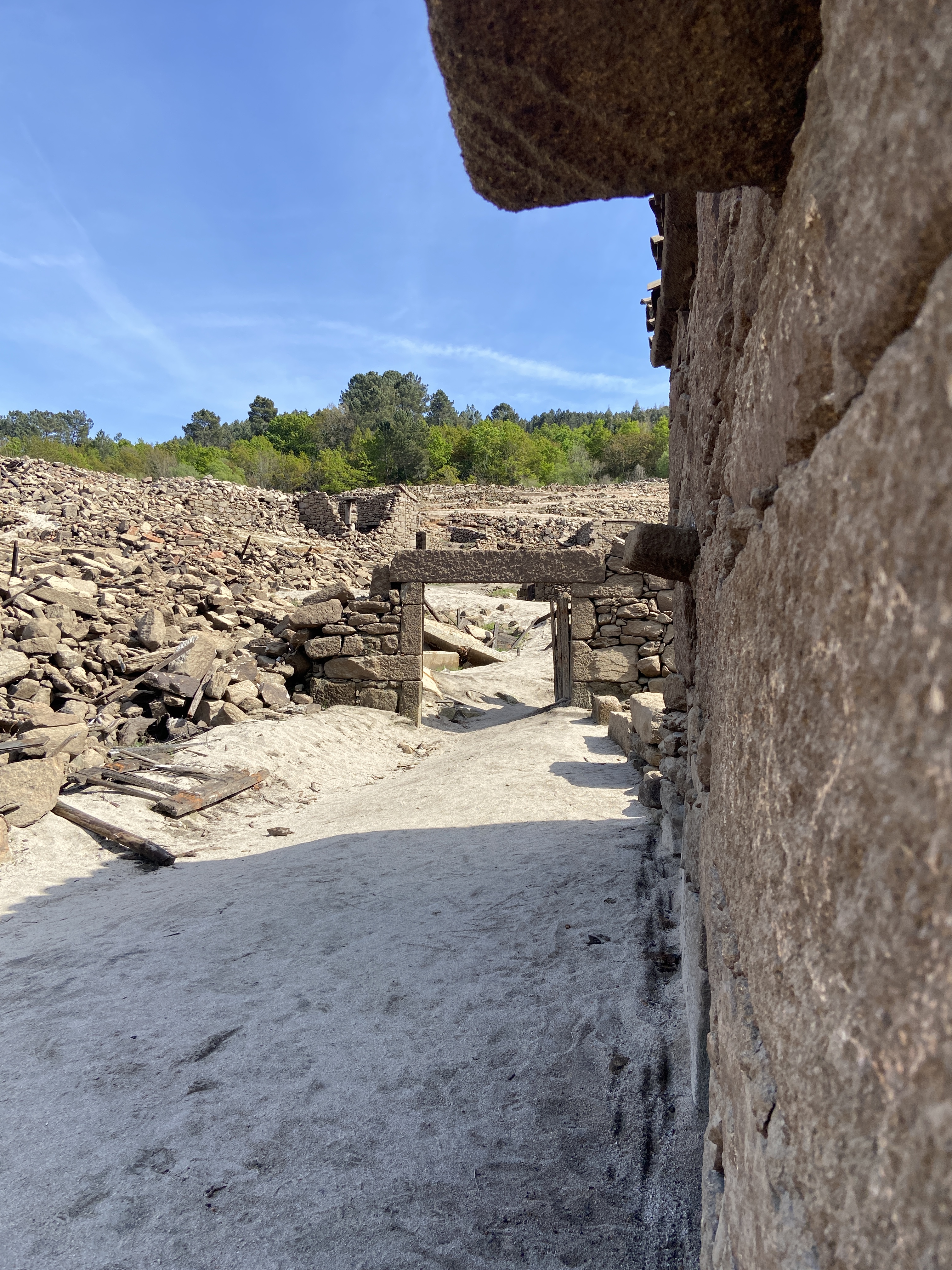 É um cenário apocalíptico o que nos espera naquelas margens lamacentas do Lima. O nosso filho adorou, claro, e uma parte de mim também ficou fascinada, pois havia algo de cenário cinematográfico na inverosimilhança daquela paisagem. As ruínas são autênticos palimpsestos sobre os quais o olhar e a mente oscilam indecisos entre o que se vê e o passado que se imagina ter ali existido. É por isso inevitável sentir igualmente um misto de tristeza e pudor quando se caminha por estes vestígios de casas, eidos, logradouros, ruelas, praças e pontes. O silêncio seria absoluto, não fosse a fonte da aldeia que, indiferente às vicissitudes do tempo e dos homens, continua a brotar. Incessantemente.
