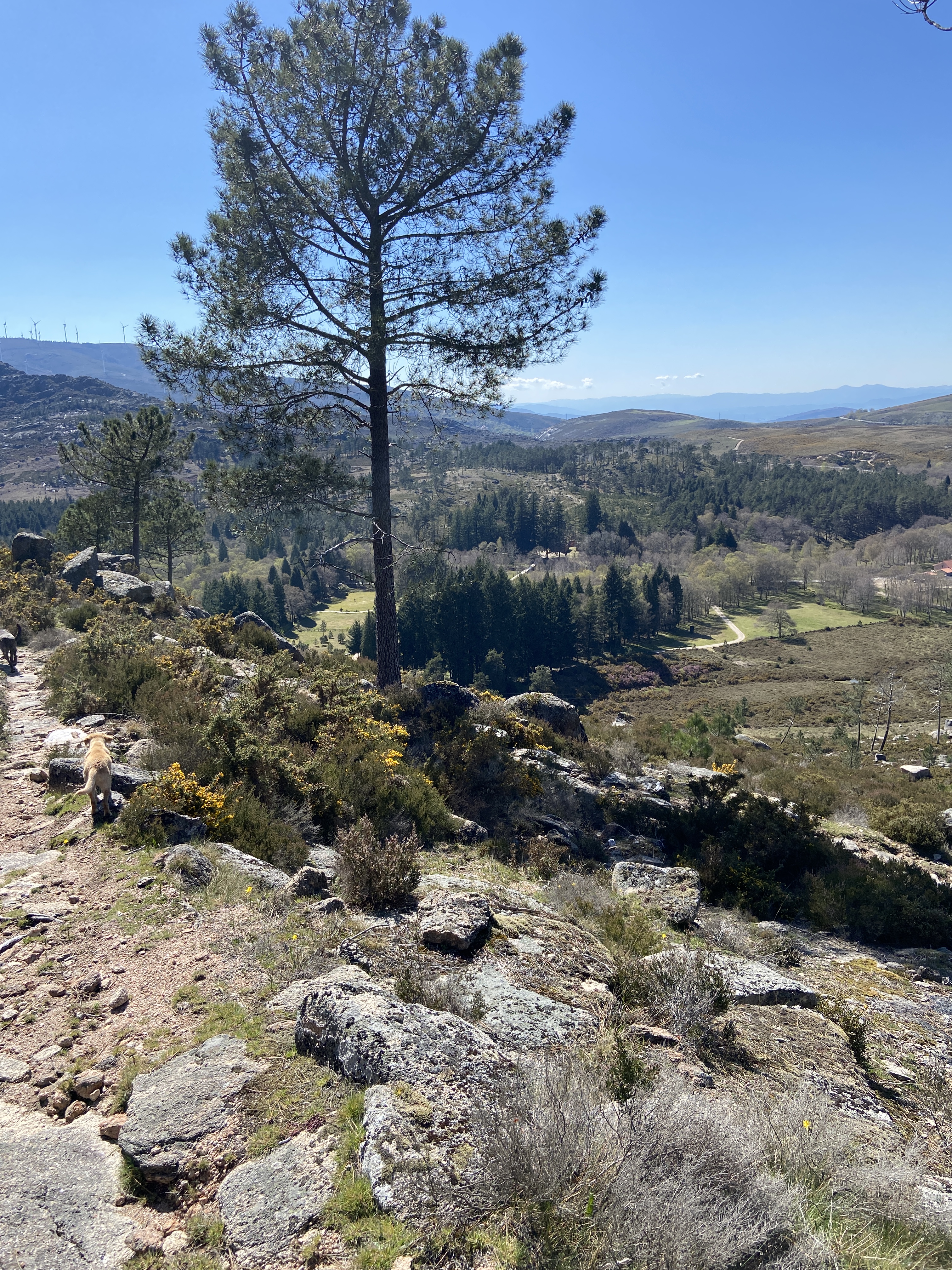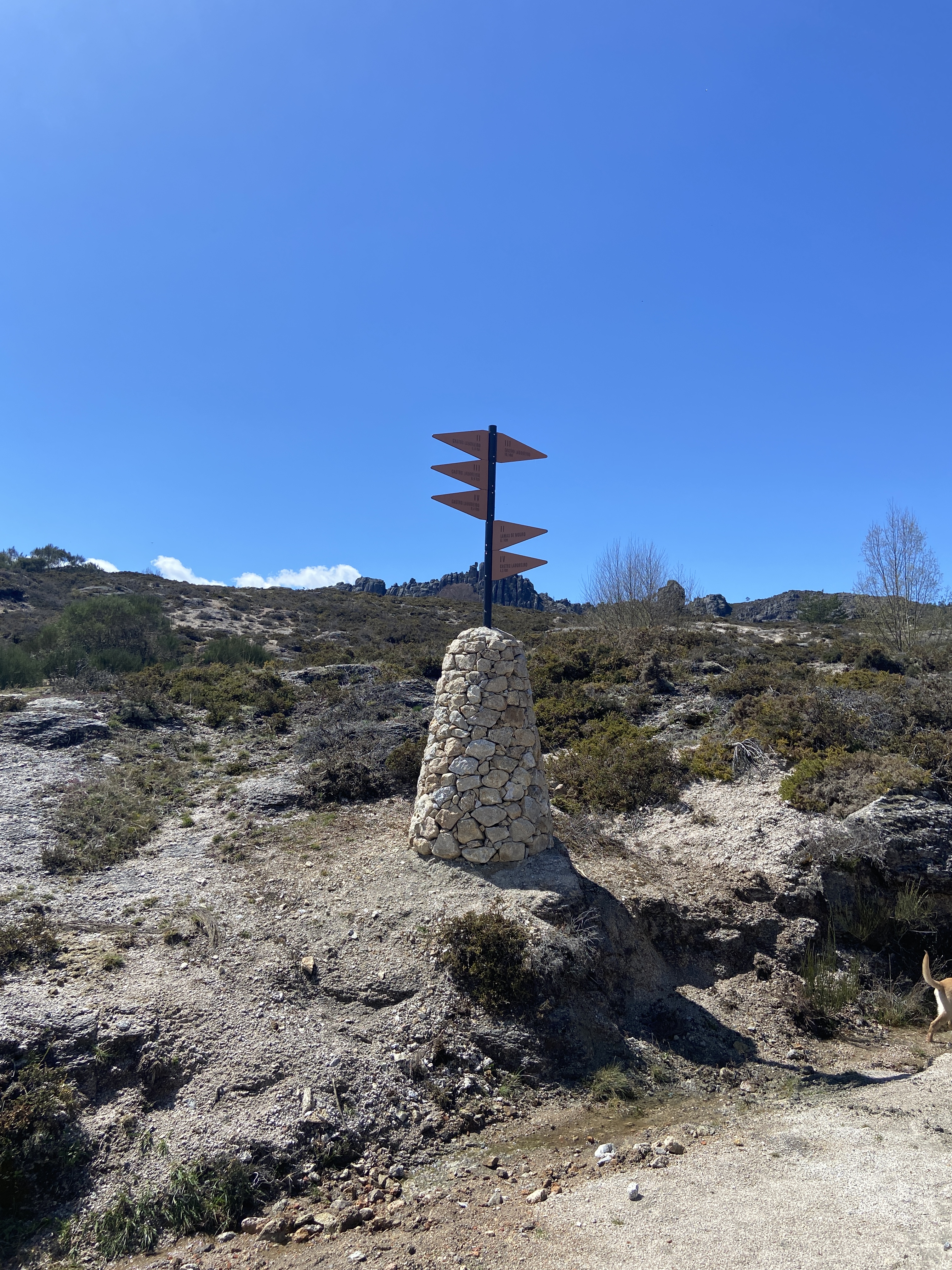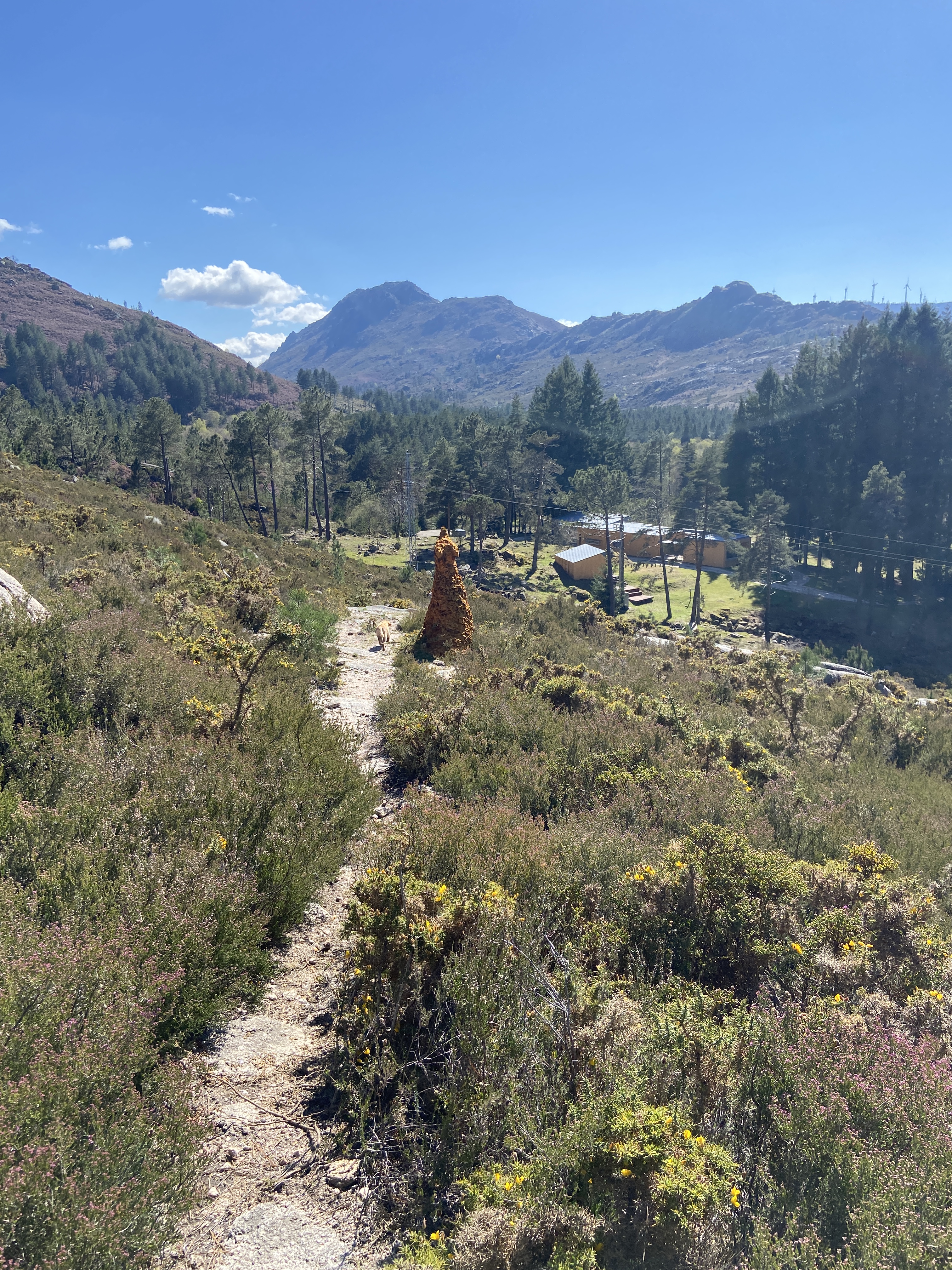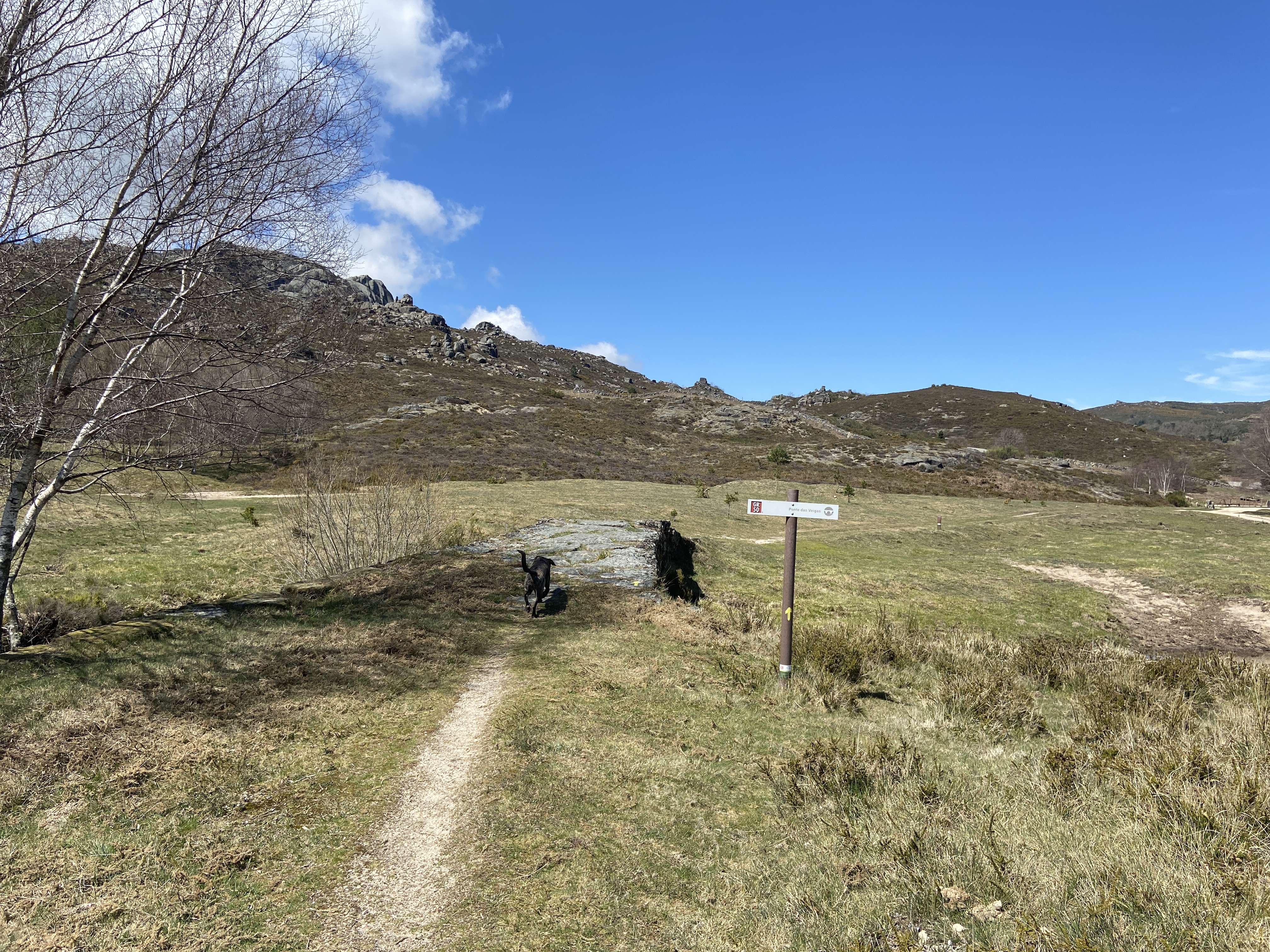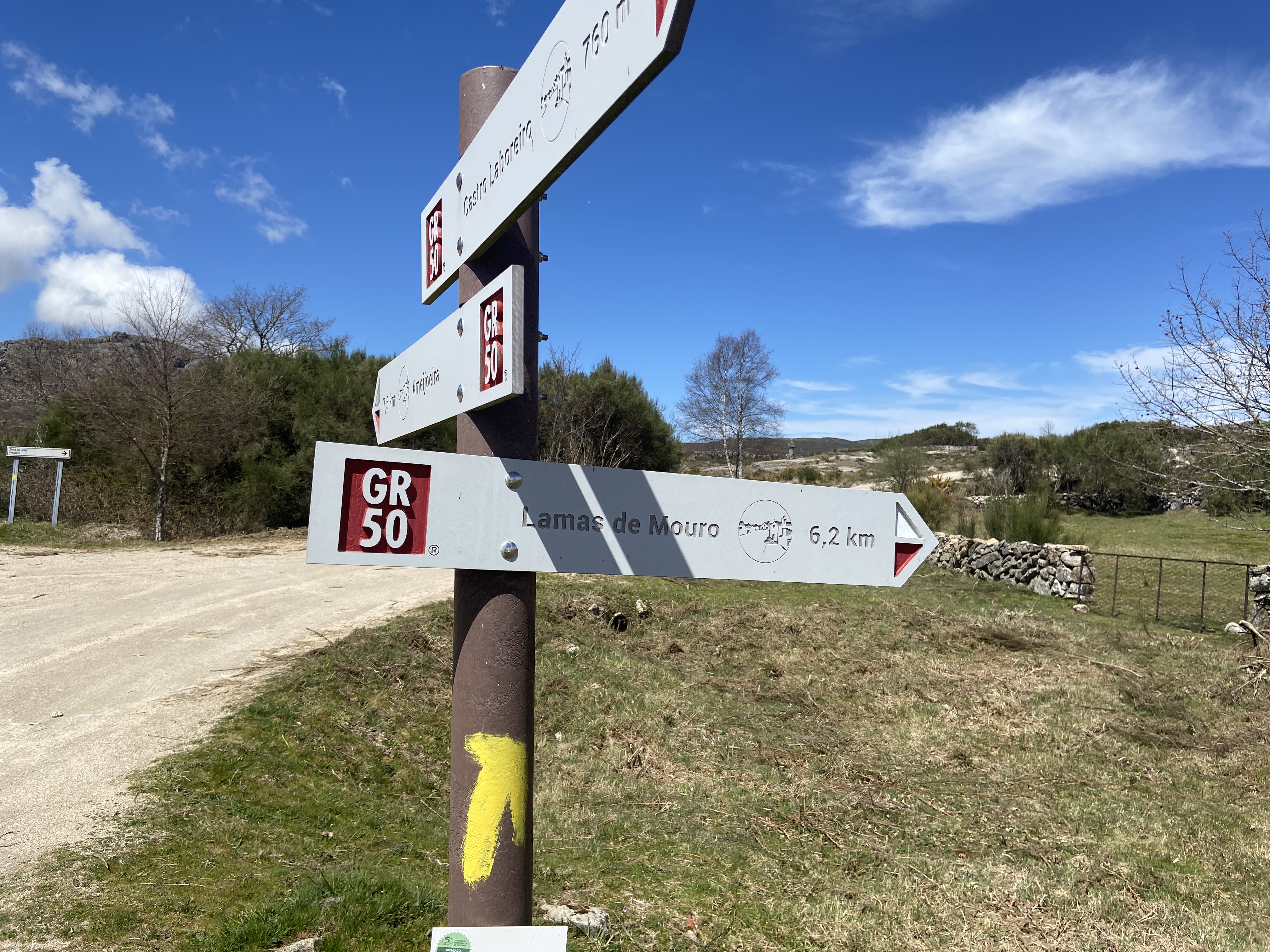 Um pouco mais a Norte, atinge-se uma zona húmida (denominada complexo higroturfoso) e apercebemo-nos pela primeira vez que a marcação das distâncias nos marcos ignora cerca de 1km (a etapa tem 7km e não 6km). Nada de grave, pois a partir daí o percurso é sempre a descer por afloramentos rochosos até Lamas de Mouro, passando por uma bela escultura em homenagem ao mais distinto habitante das paragens: o lobo ibérico. Quando chegámos à Porta de Lamas de Mouro, tínhamos uma dezena de cavalos garranos para nos receber no famoso bosque de floresta mista.
