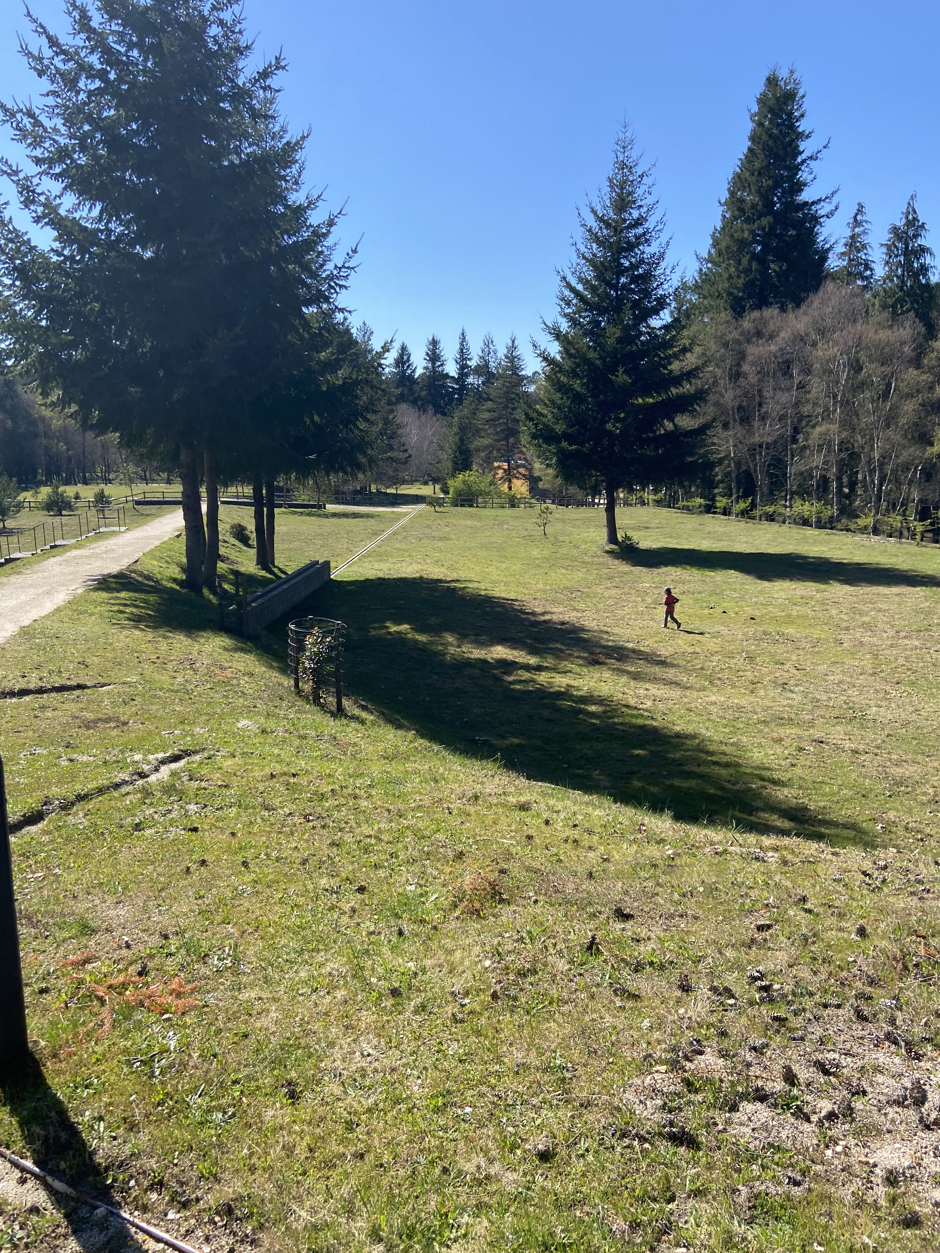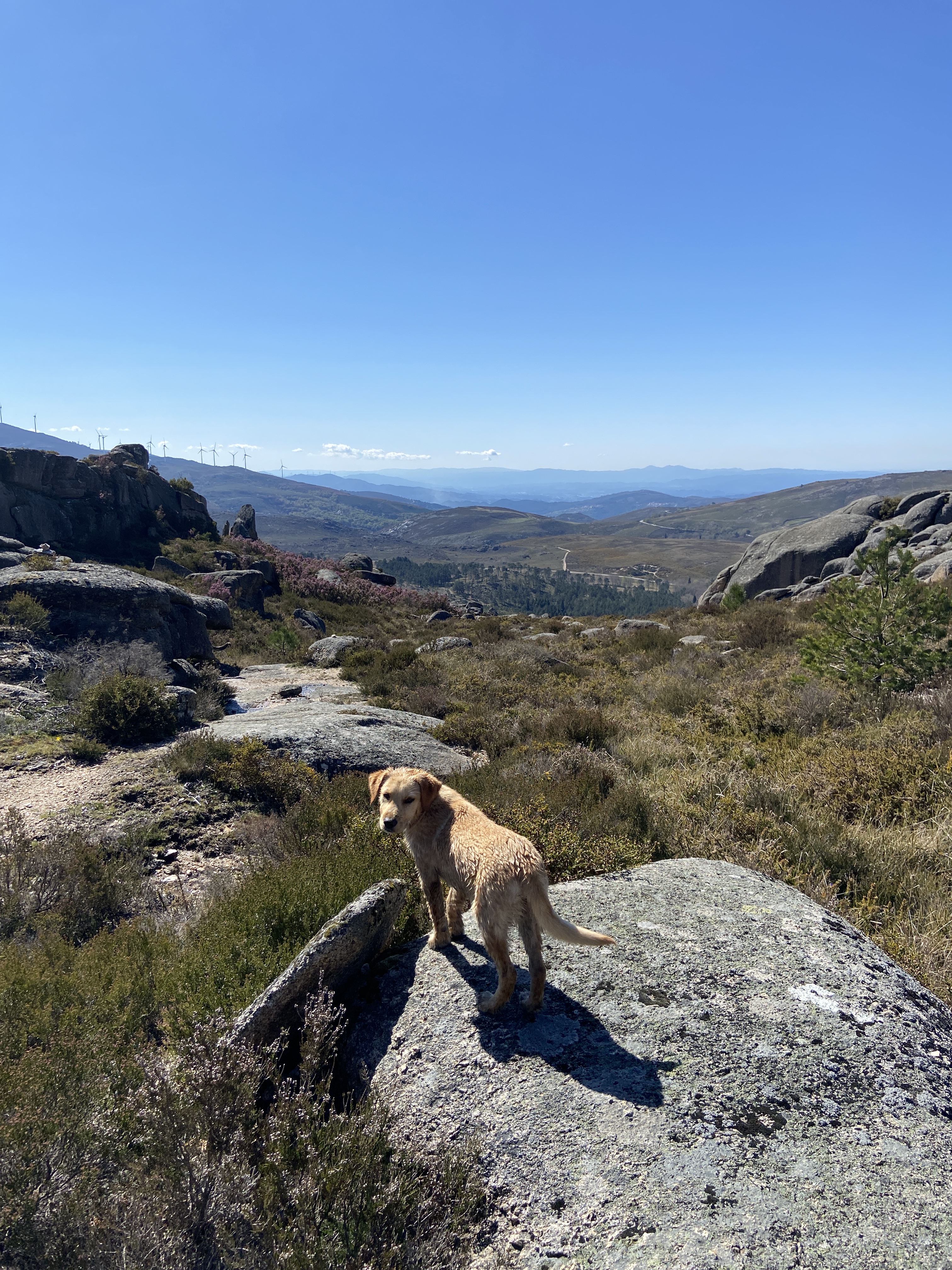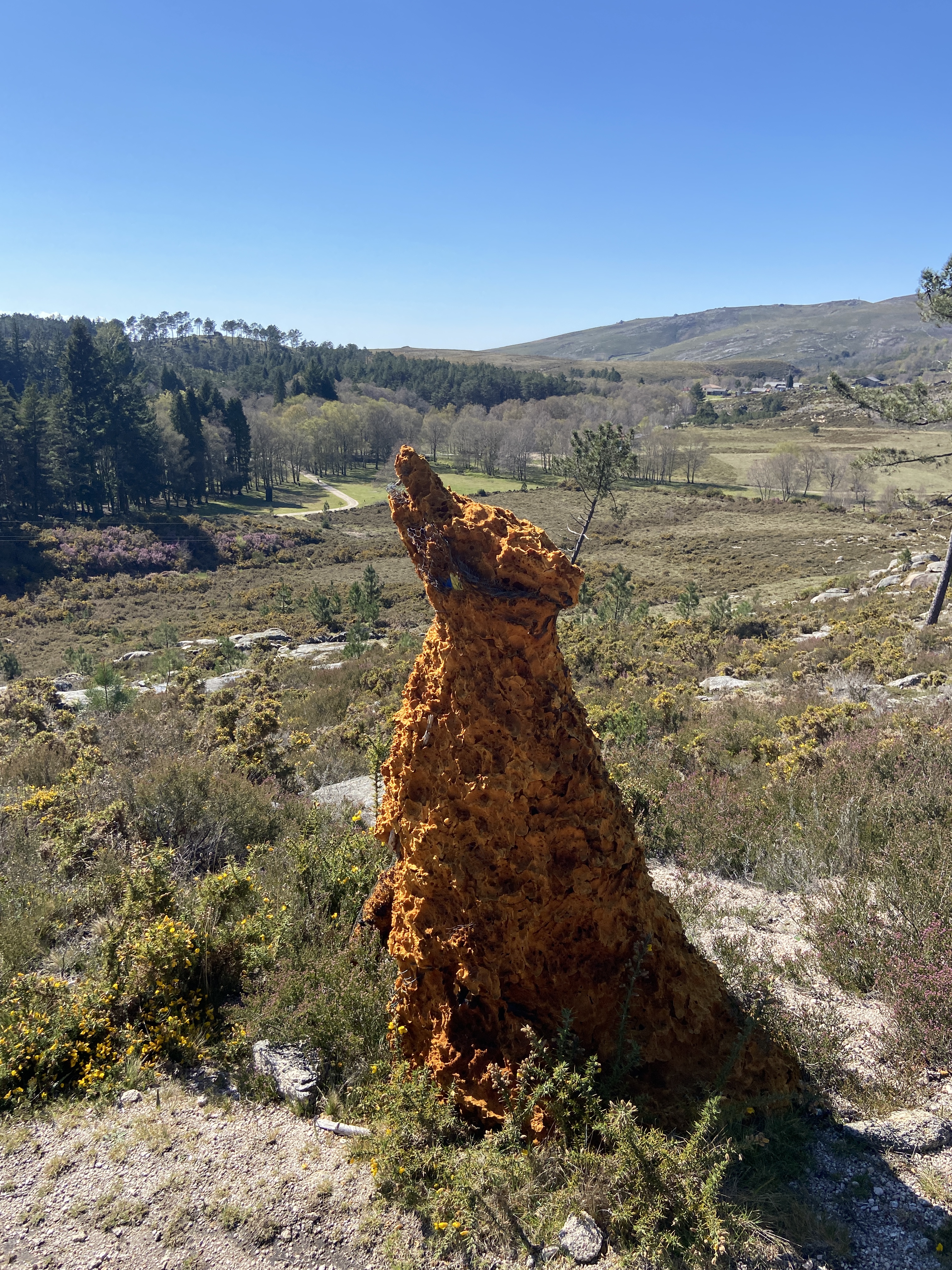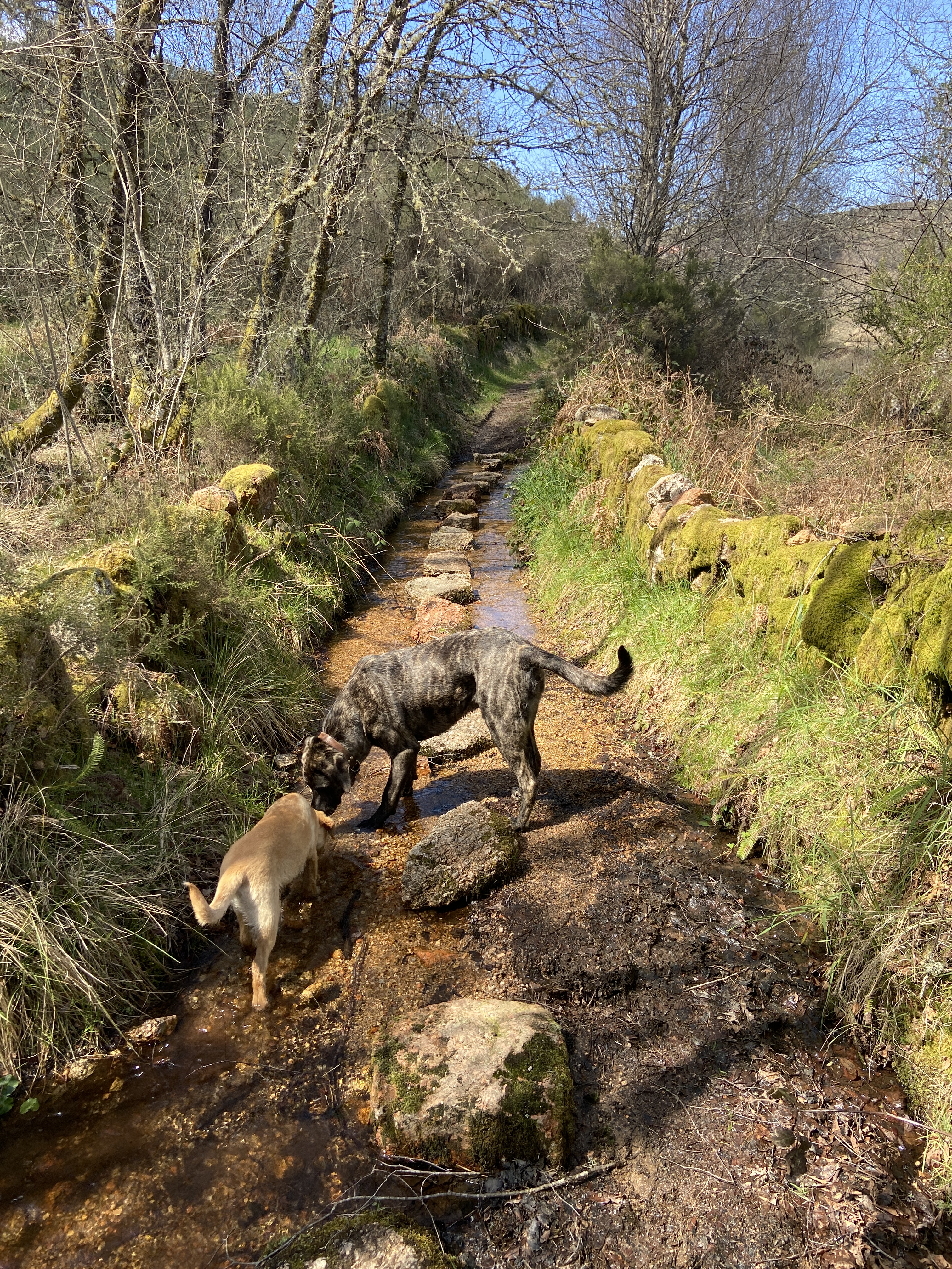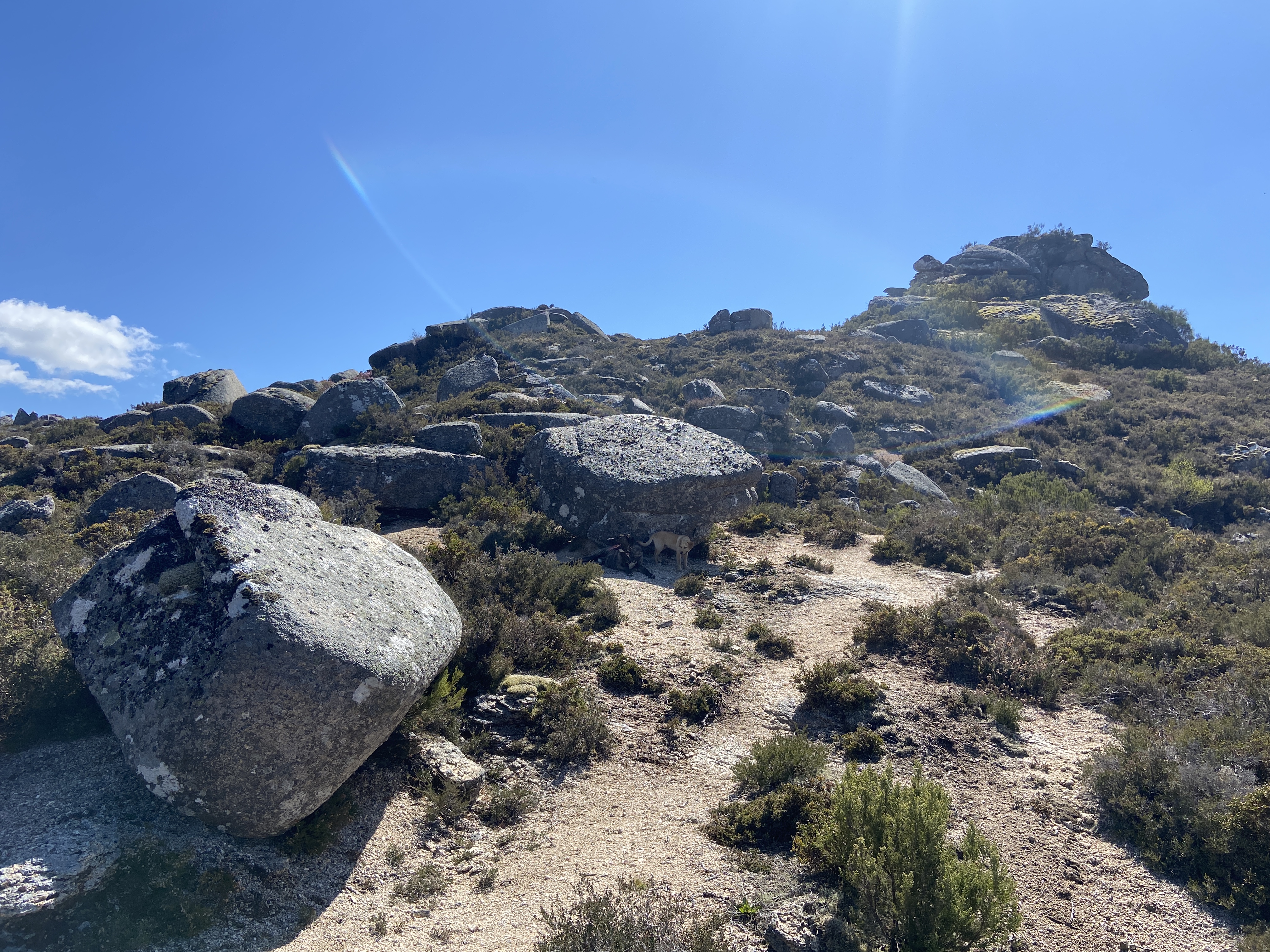 Um pouco mais a Norte, atinge-se uma zona húmida (denominada complexo higroturfoso) e apercebemo-nos pela primeira vez que a marcação das distâncias nos marcos ignora cerca de 1km (a etapa tem 7km e não 6km). Nada de grave, pois a partir daí o percurso é sempre a descer por afloramentos rochosos até Lamas de Mouro, passando por uma bela escultura em homenagem ao mais distinto habitante das paragens: o lobo ibérico. Quando chegámos à Porta de Lamas de Mouro, tínhamos uma dezena de cavalos garranos para nos receber no famoso bosque de floresta mista.