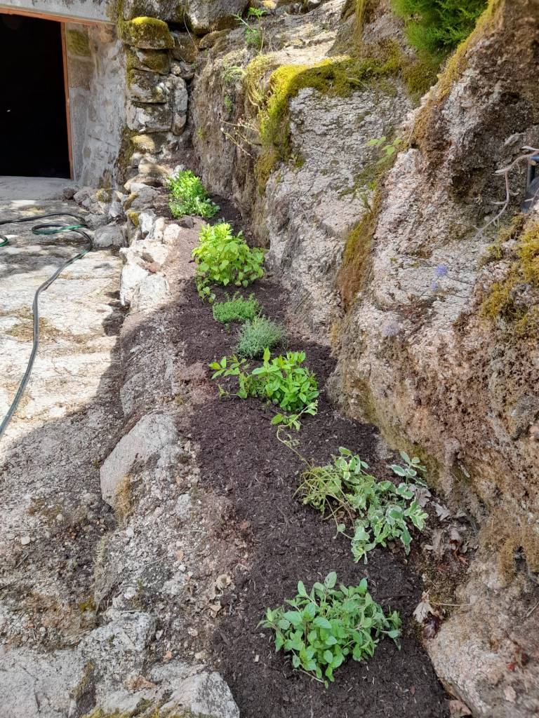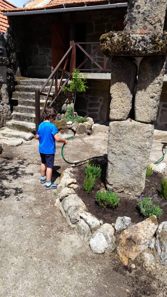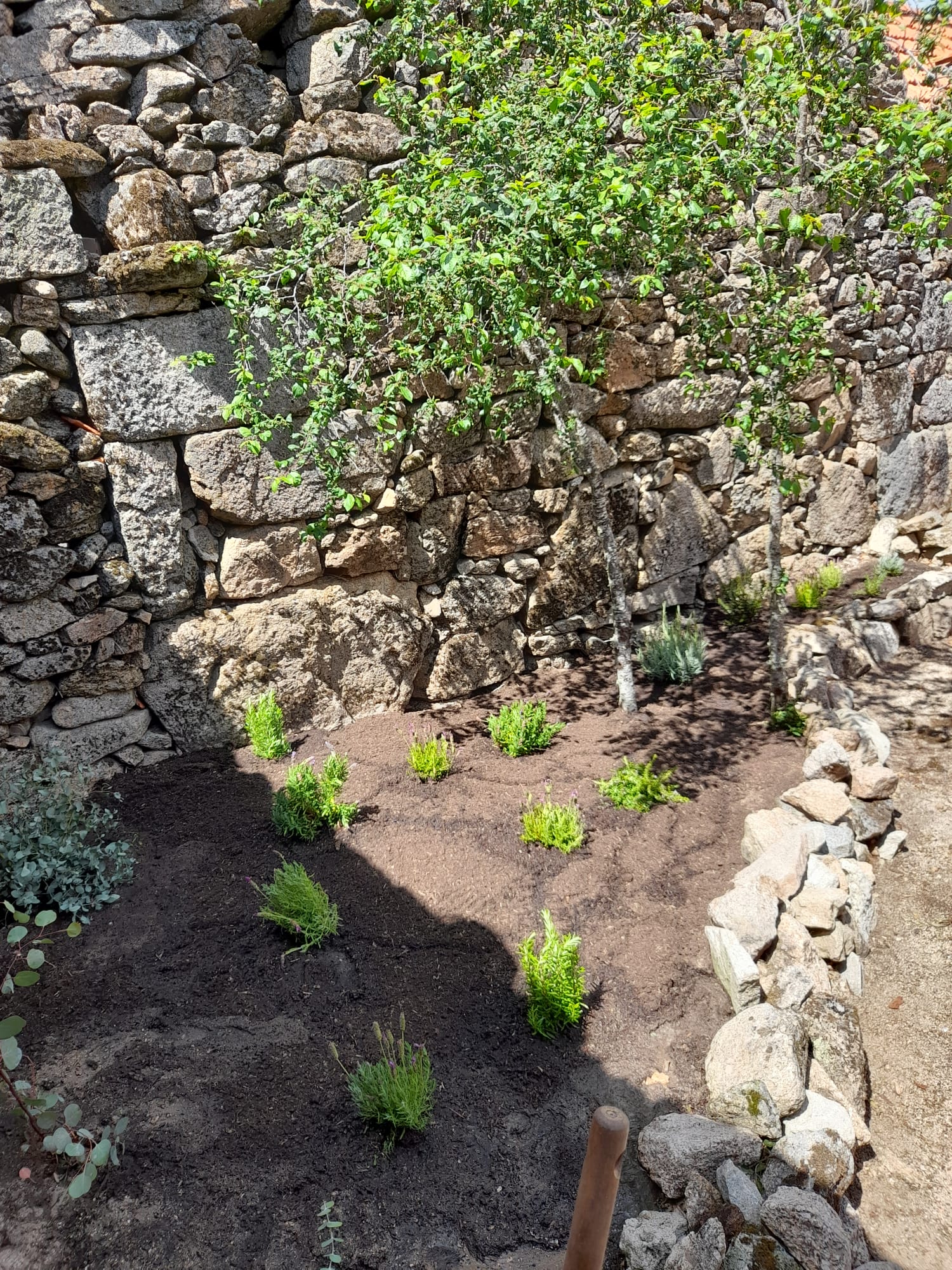 Aproximam-se as férias e, com elas, grandes mudanças no nosso (futuro) cantinho: em Setembro, se tudo correr de feição, estarei aqui para fazer um balanço. Para já, aproveitamos este fim-de-semana para dar cor, cheiro e textura aos canteiros do pátio da frente da casa, a um pequeno nicho exterior e ainda a um canteiro lateral que dá acesso às traseiras. Alfazema, lavanda e rosmaninho mas também um trio de eucaliptos ornamentais e, projecto de longa data da Manela, uma pequena eira de aromáticas onde dominam as hortelãs (pimenta, chocolate, ananás, limão, etc.). O Joãozinho ajudou imenso e fez questão de participar em todas as fases da empreitada: distribuição das plantas, colocação de estrume e rega. Temos jardineiro.