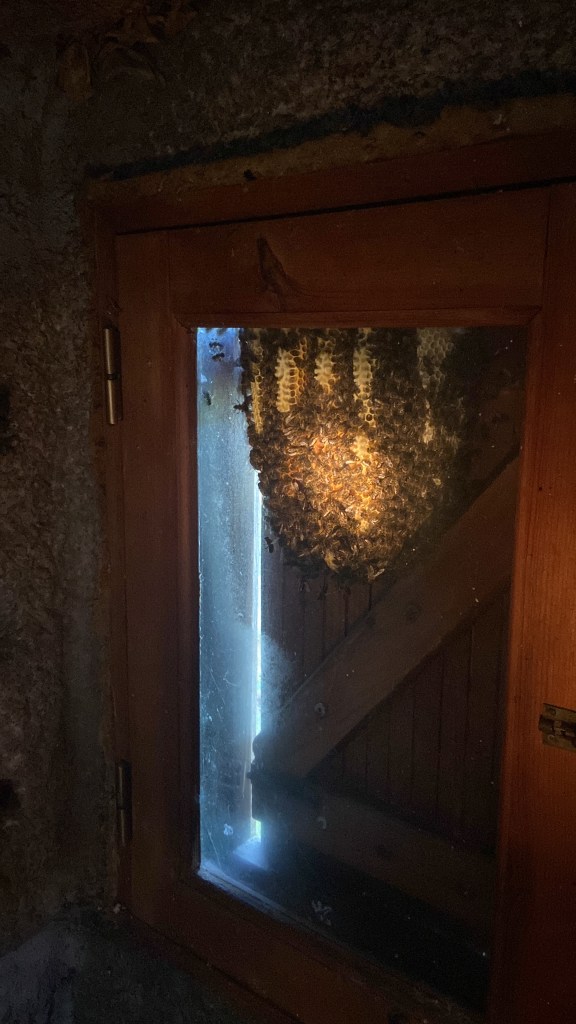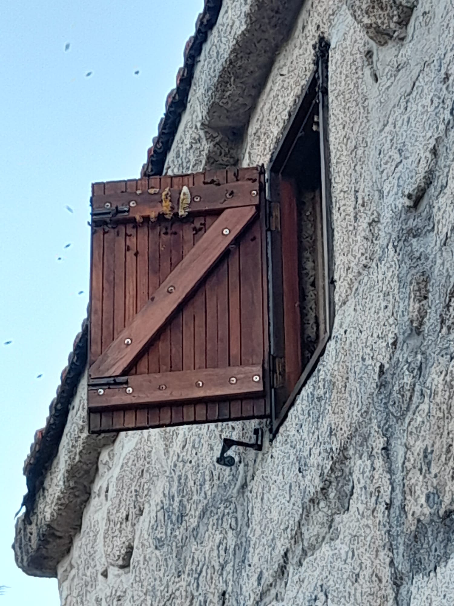 Há cerca de dois meses, apercebemos-nos que estava a nascer entre a portada e a janela do nosso futuro quarto virado para nascente uma colmeia de abelhas. Foi tudo muito rápido: se, duas semanas antes, a portada e a janela não tinham qualquer vestígio destas distintas voadoras, duas semanas após a descoberta, a colmeia já tinha duplicado de tamanho e a colónia teria já mais de uma centena de abelhas.