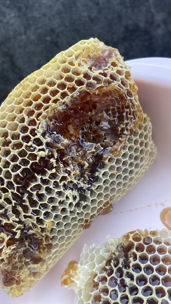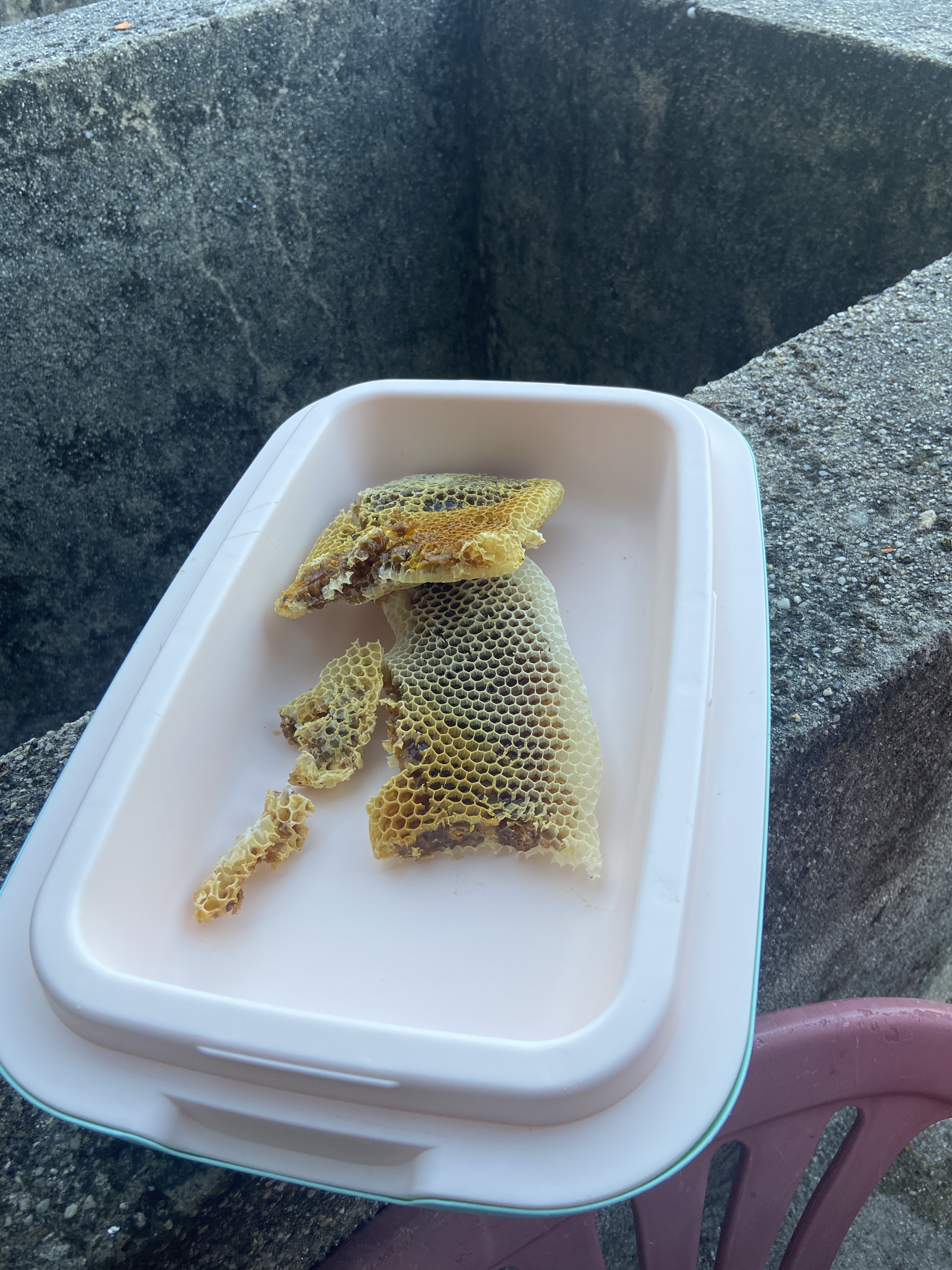 O grande dia chegou no Sábado passado. No final da tarde, após uma viagem de uma hora, a família da Maria José e do João chegou para nos salvar. Devidamente equipados e ao longo de várias horas (que meteu pelo meio uma ida-relâmpago a um restaurante na vila para jantar), os nossos apicultores conseguiram não apenas transladar a colmeia com sucesso para o interior da caixa, como colher o mais doce mel que alguma vez provei na minha vida. Foi uma experiência emocionante, com momentos de suspense, drama e muita emoção, sobretudo para os mais pequenos (João, Laura e Alice) e para a Margarida, que, para além de ser nossa amiga e mãe das pequenas, se revelou uma genuína aficionada do universo das abelhas.