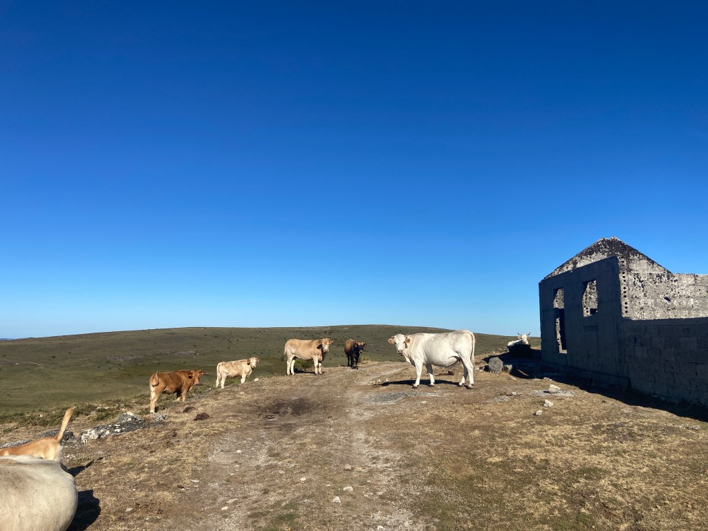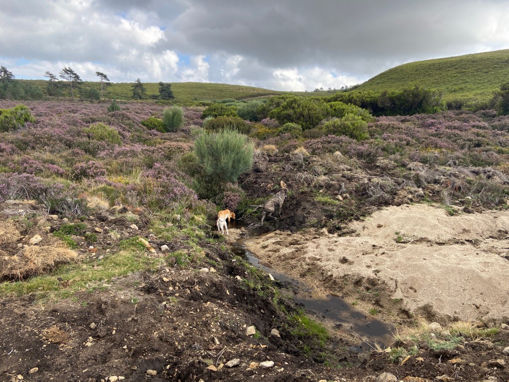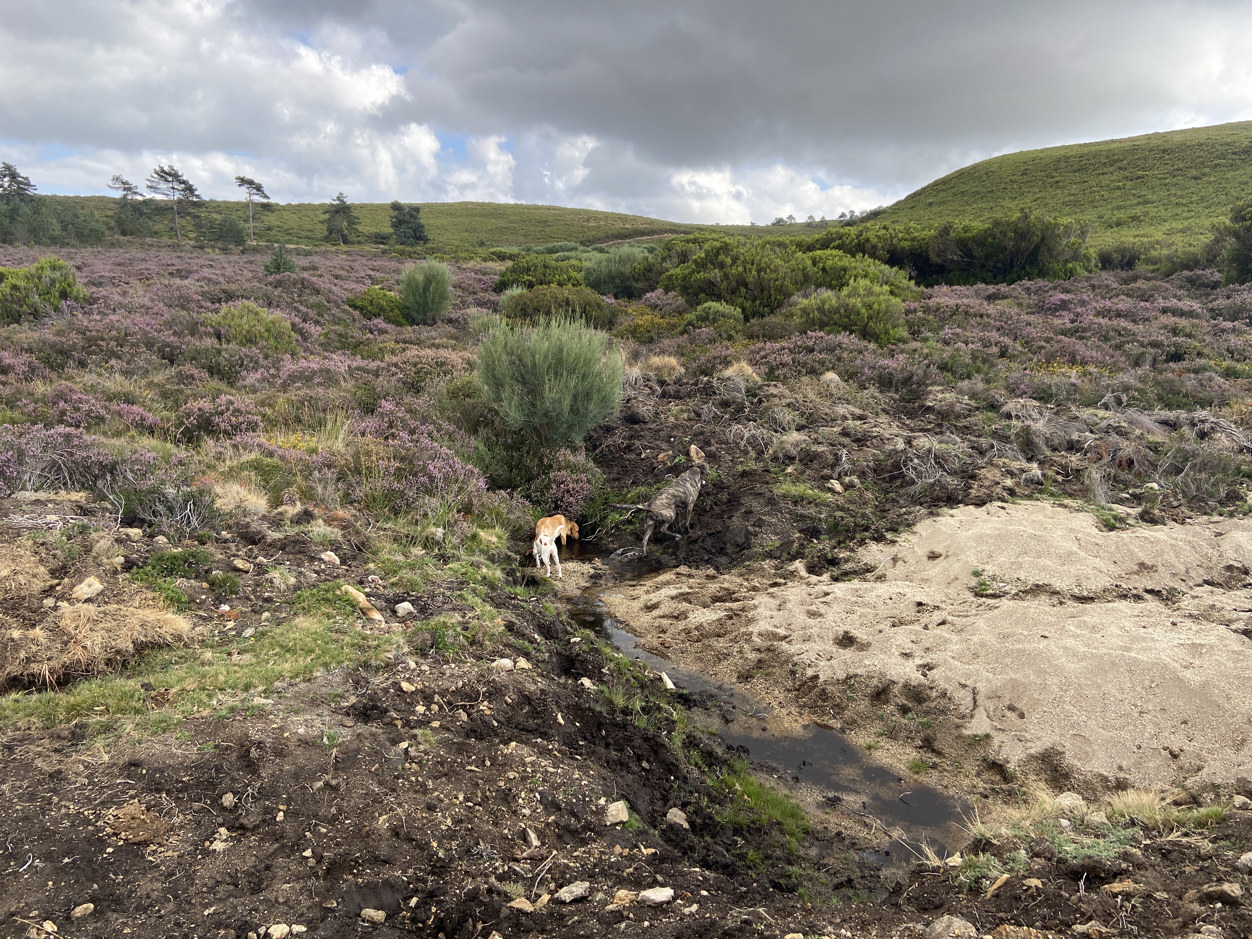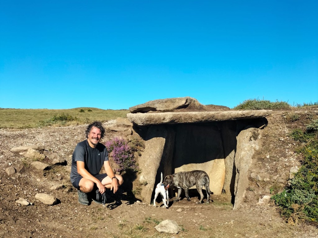 Poucos dias depois, o Frederico e eu pegámos novamente nos cães e fizemos a correr o mesmo percurso de ida só que, em vez de regressar a Portos, prosseguimos até à belíssima aldeia do Rodeiro (onde o resto da comitiva nos foi depois buscar de carro). Pelas minhas contas, tal aventura daria algo perto dos 18km e, na verdade, não fiquei longe de acertar: eram afinal 17km (ou 16 se o percurso não incluir desvios para ir espreitar as mamoas). Cruzámo-nos com gado vasto, imensos cavalos garranos, águias e peneireiros. Todo o esforço da corrida foi compensado pela imensa alegria que sentimos por ter a sorte de percorrer o misterioso estradão de terra repleto de bifurcações para o desconhecido. O terreno é óptimo para correr e apenas os primeiros quilómetros é que sobem bastante: depois a altitude estabiliza nos 1300m antes de descer, mesmo no final, para o Rodeiro. A nascente, temos constantemente o planalto galego e, a poente, o omnipresente marco geodésico do Alto do Giestoso.