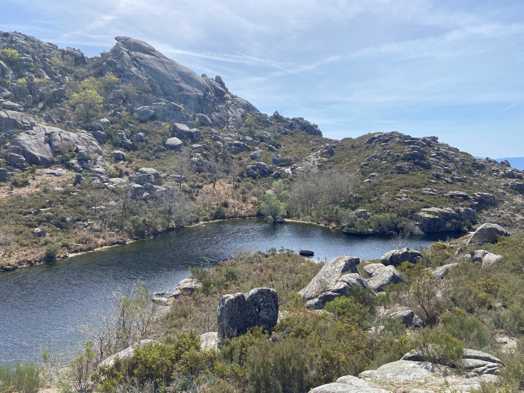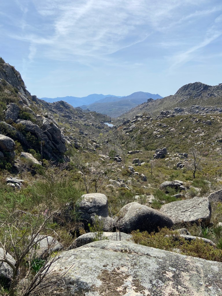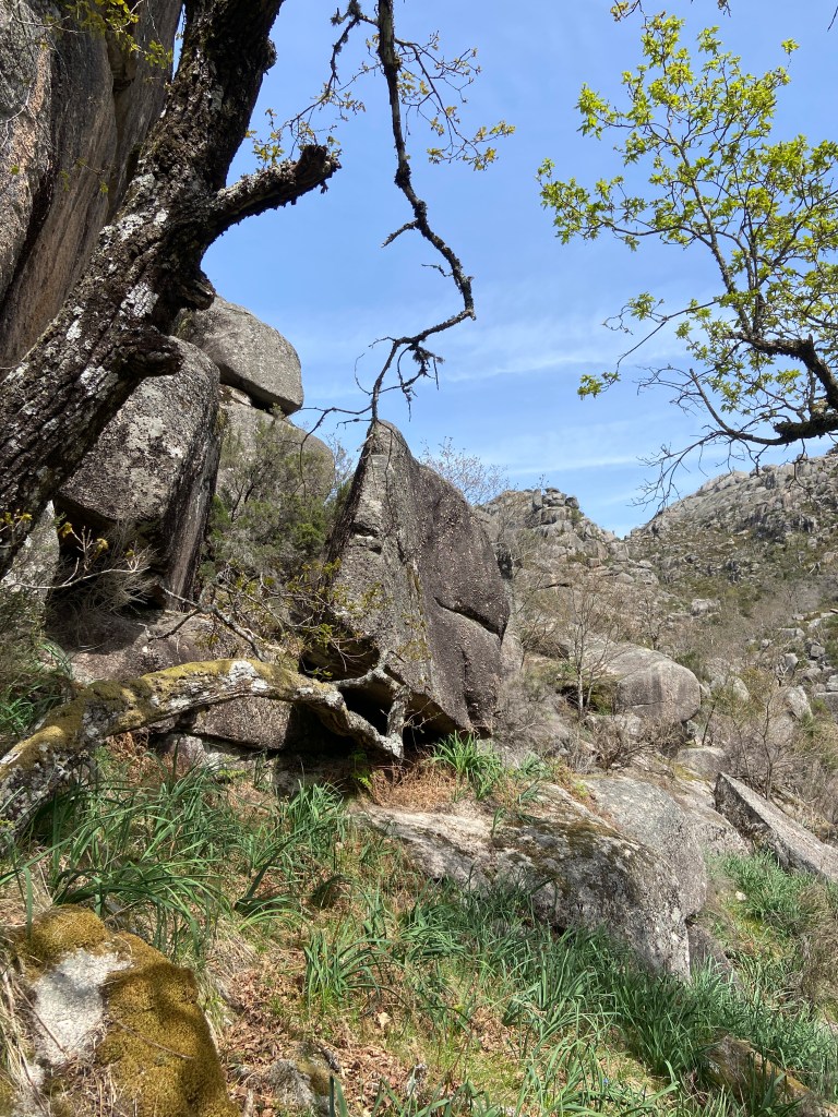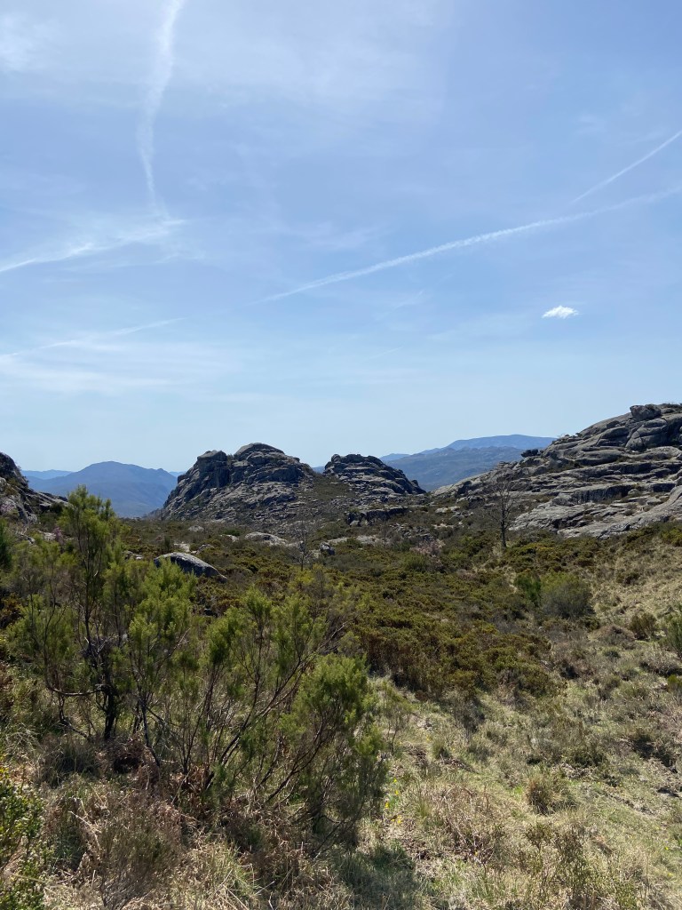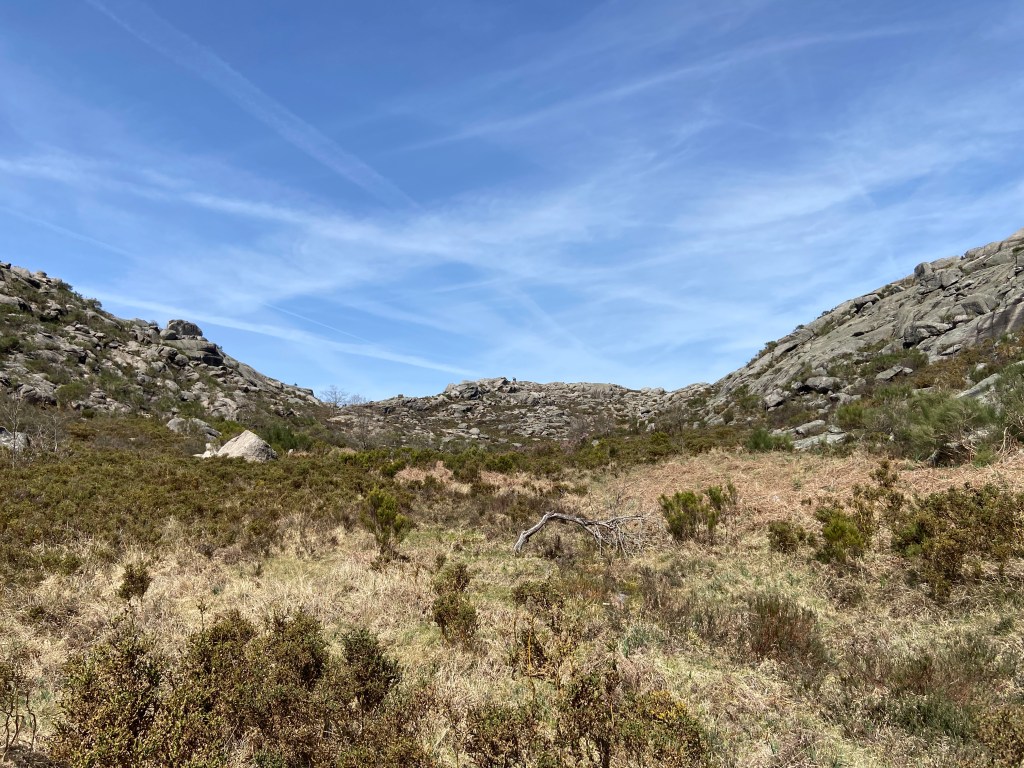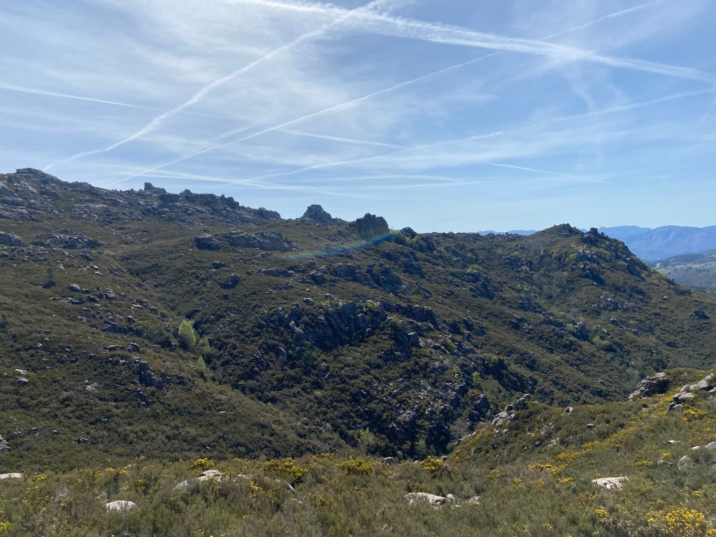Em primeiro lugar, porque há uma tendência natural para olhar para o traçado de um trilho de forma anacrónica. Lá por alguém ter conseguido fazer o percurso a pé em 2013 não significa que seja possível fazer o mesmo dez anos depois. E, de facto, o caminho estava fechadíssimo com urze até à cintura, giestas afiadas e rochas tão íngremes que nos forçaram a improvisar quando nos dávamos conta que o percurso original se tornara impraticável.