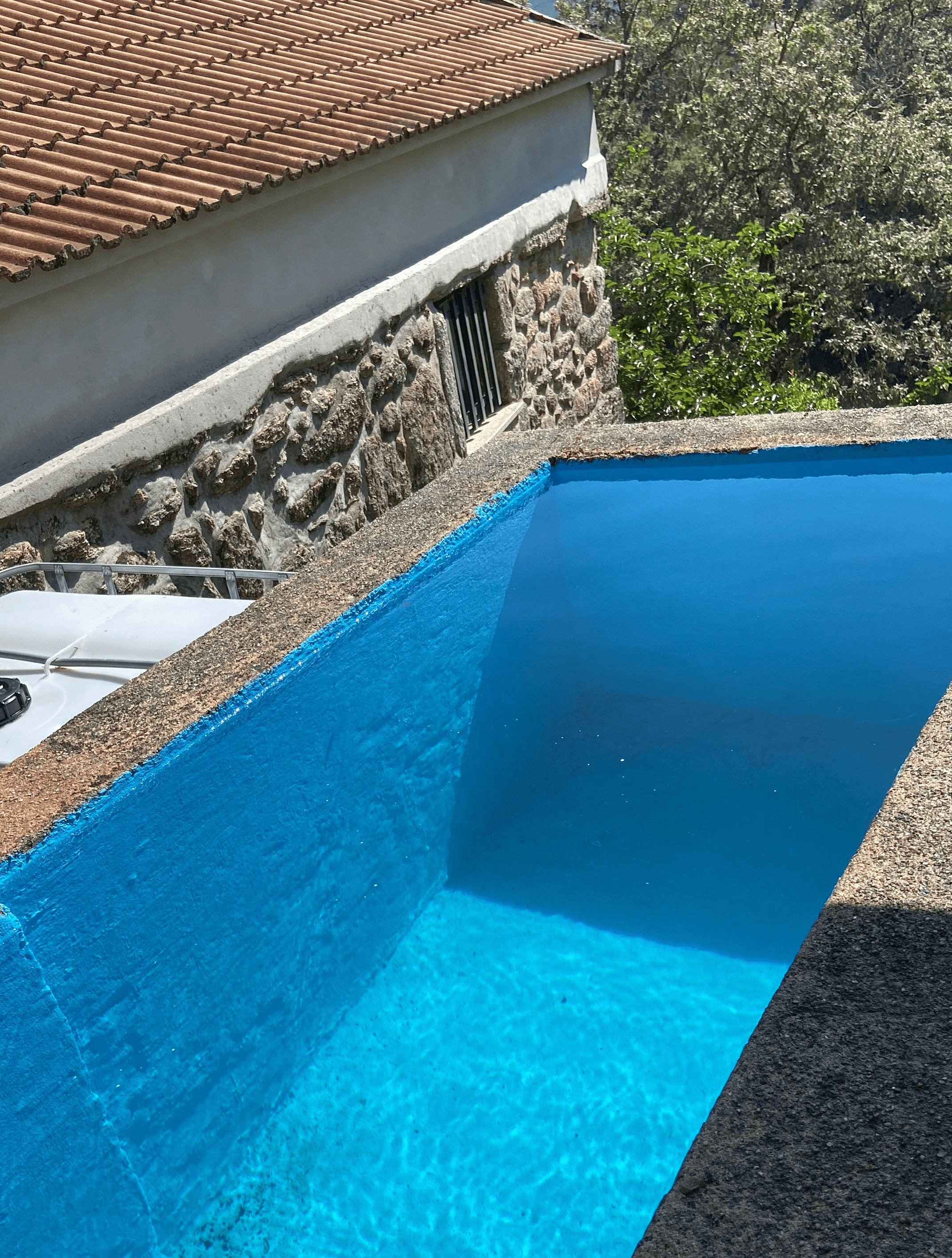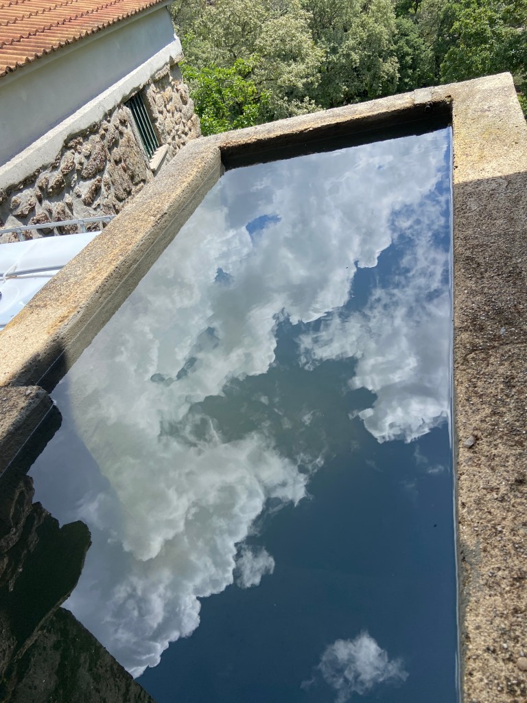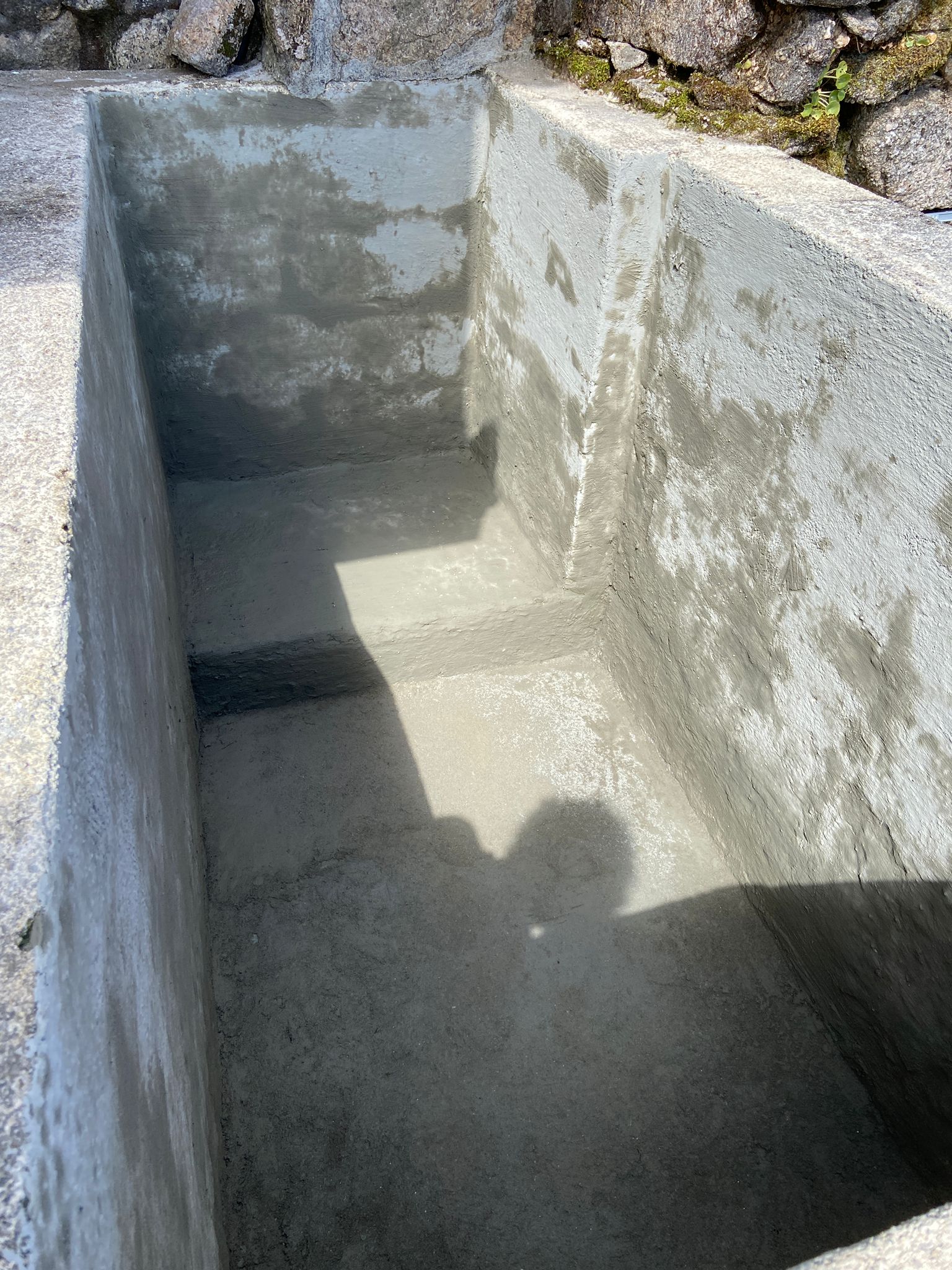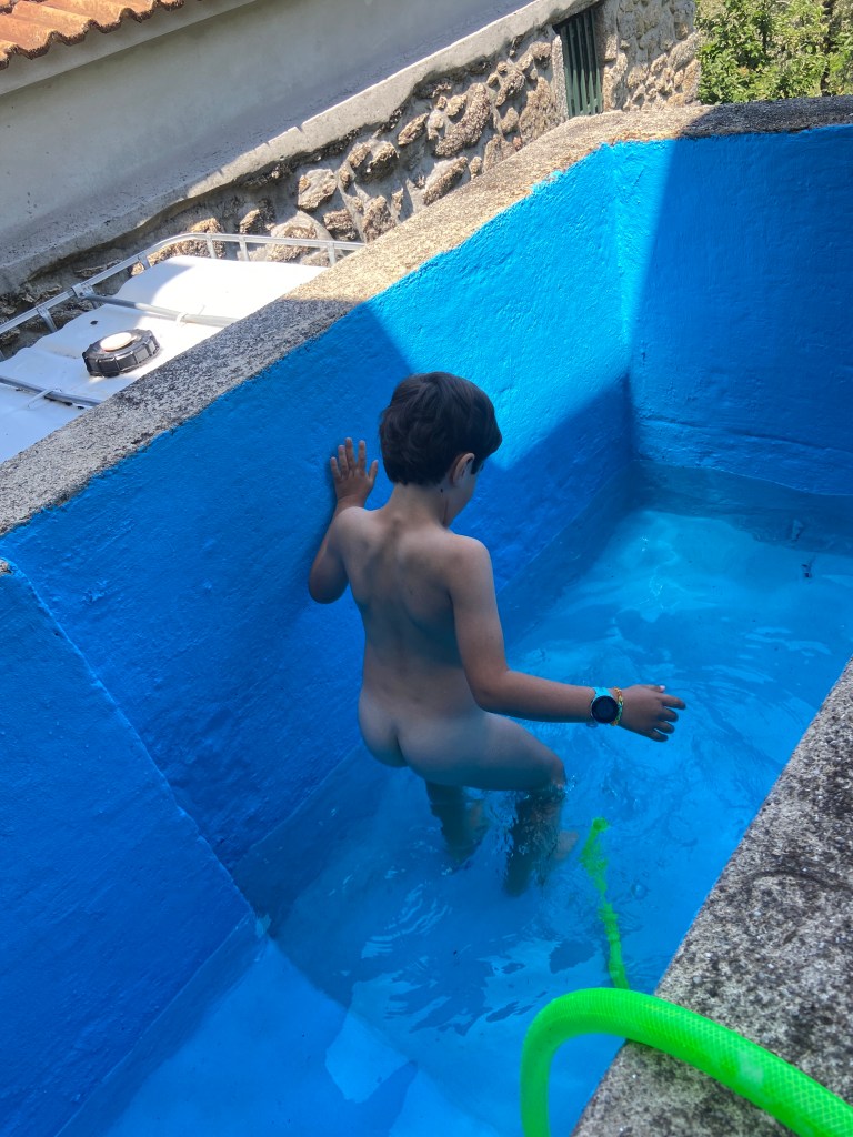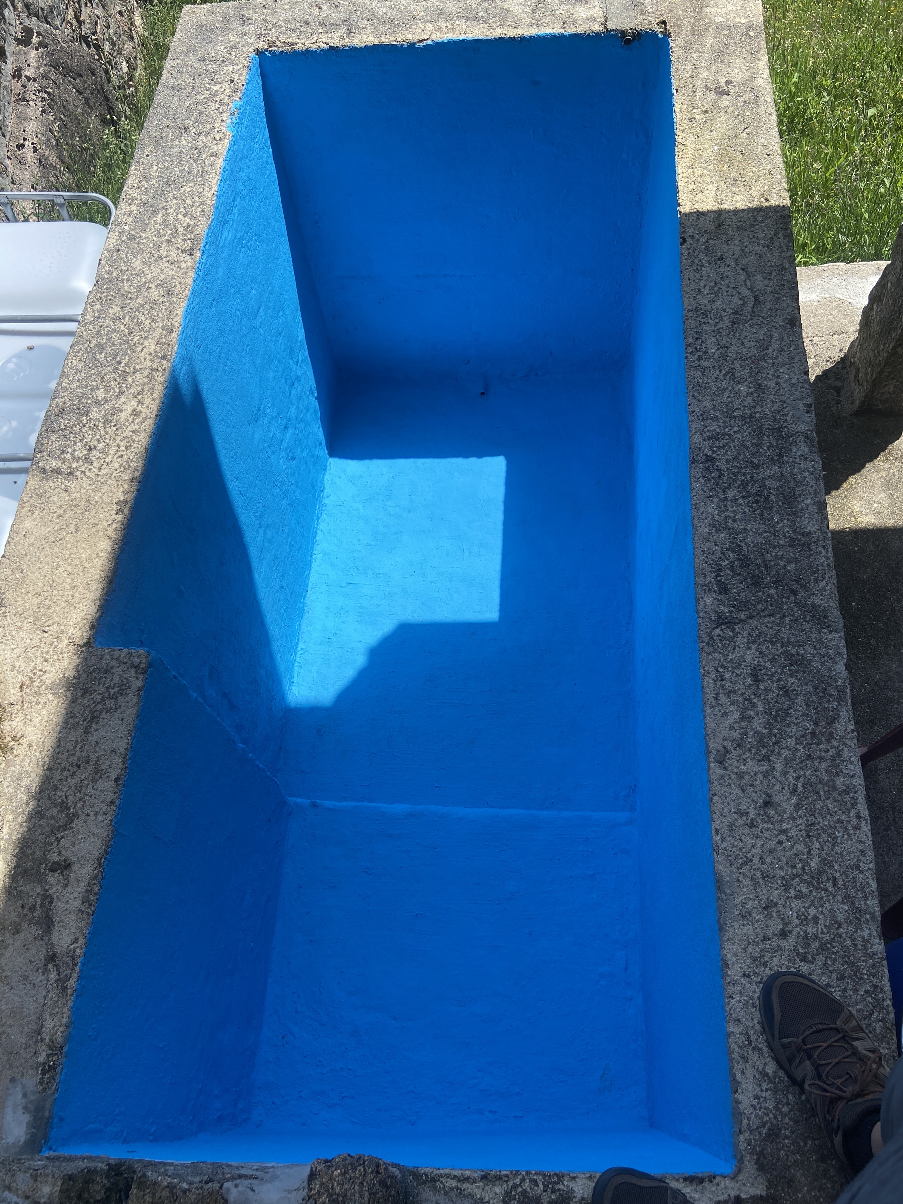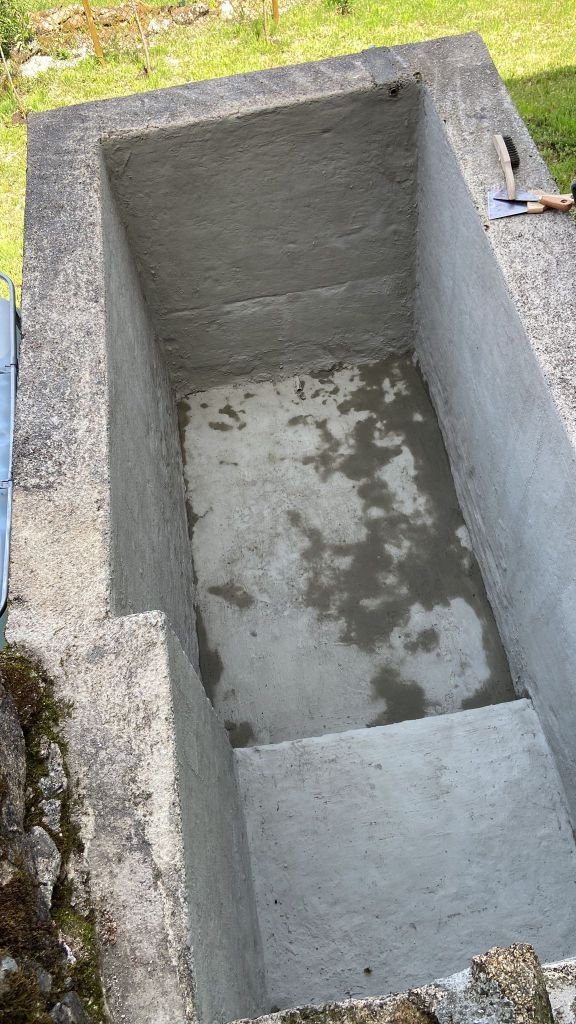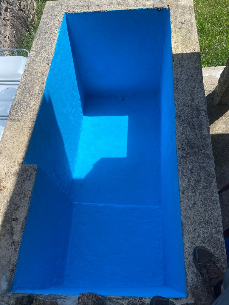 A tarefa, iniciada em meados de Abril, demoraria meses a ser concluída devido à bendita chuva que tem caído na primavera. Primeiro, tivemos de limpar e raspar o tanque todo por dentro, repleto que estava de musgo, folhas e húmus. Noutra semana, abrimos e rebocámos todas as fendas (e eram muitas) e depois ficámos a ver navios durante um mês para completar a cura do cimento e aplicar duas camadas de argamassa de impermeabilização (Weber KF). Tivemos que suportar ainda mais um mês de espera, porque entretanto choveu imenso e o tanque chegou mesmo a encher: foi preciso esperar que o tempo melhorasse e o interior secasse para aplicar duas demãos de uma tinta azul própria para piscinas (Axton). Por fim, após mais uma semana de espera recomendada pelo fabricante, abrimos as sobras do reservatório para onde desagua a água de uma das fontes naturais da Peneda (fazer chegar a água ao tanque também foi um quebra-cabeças, mas adiante).