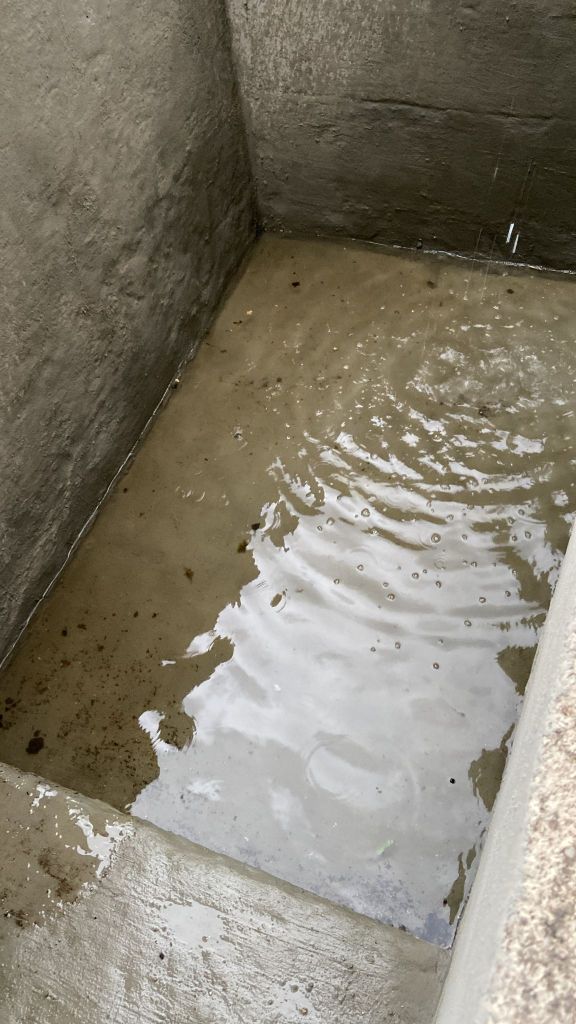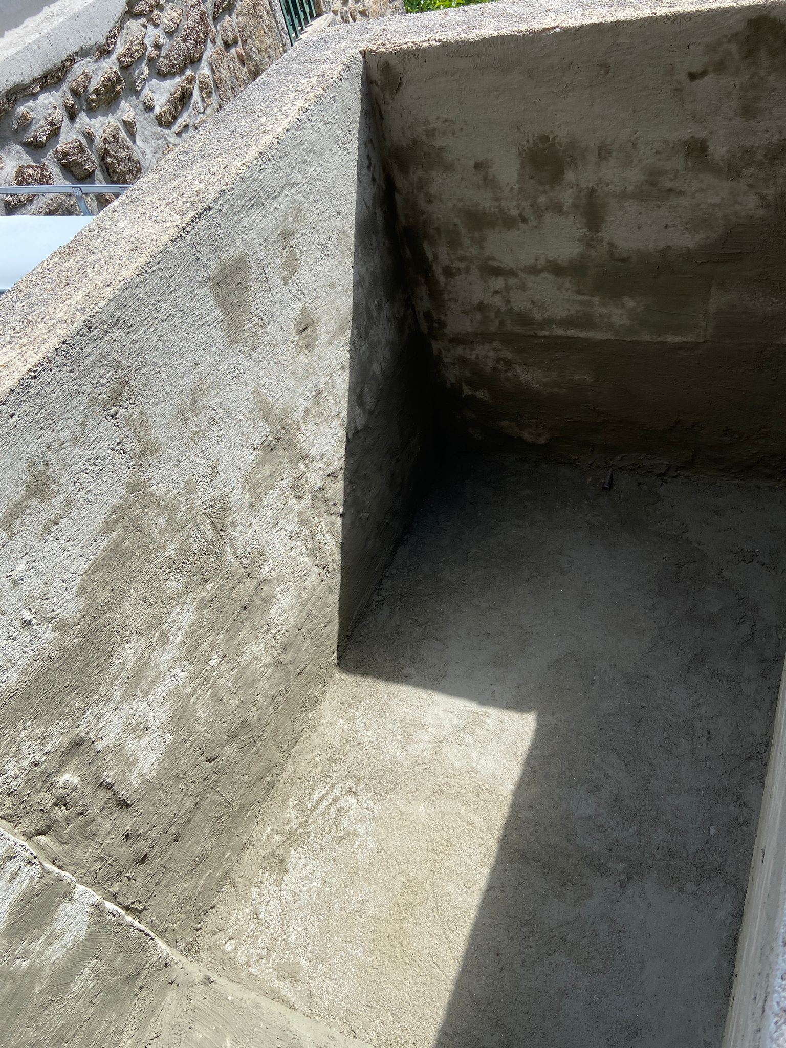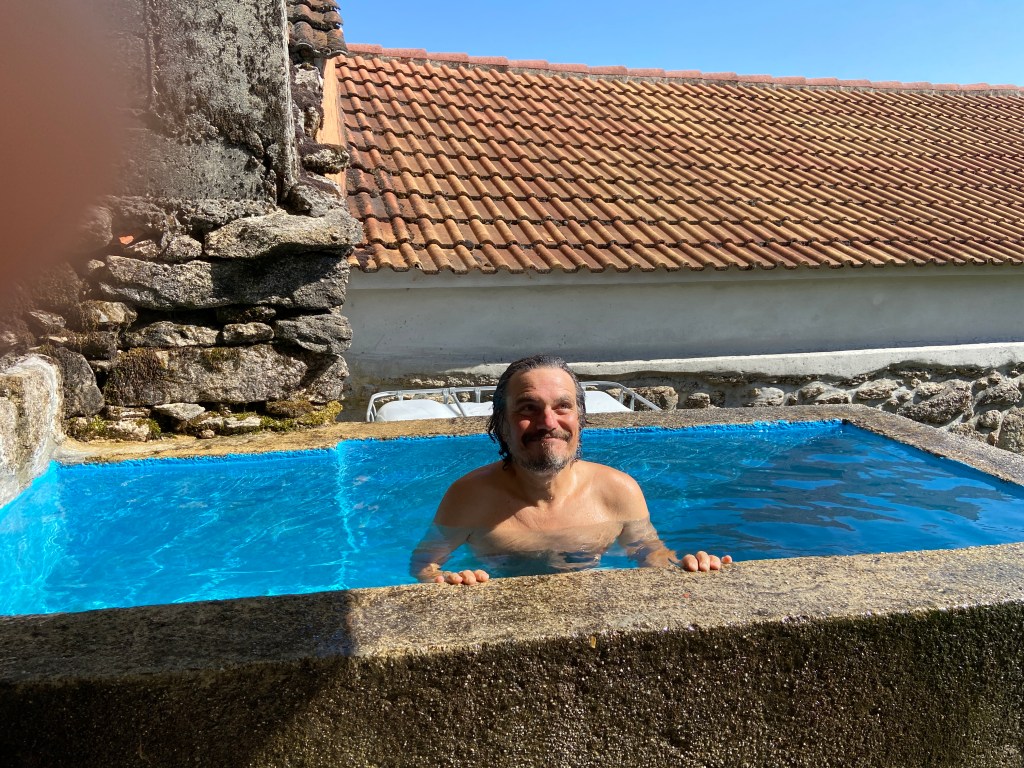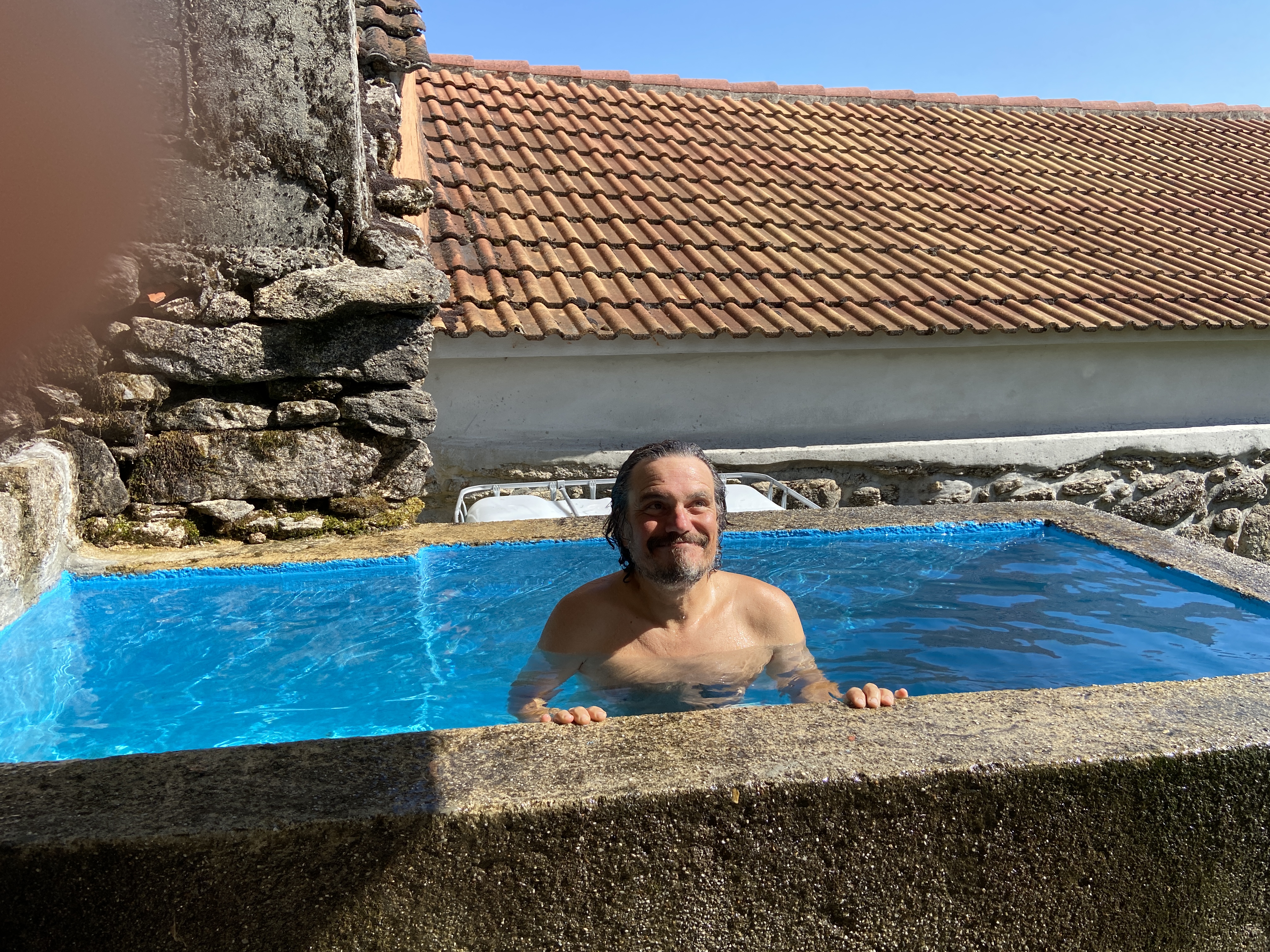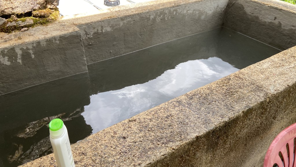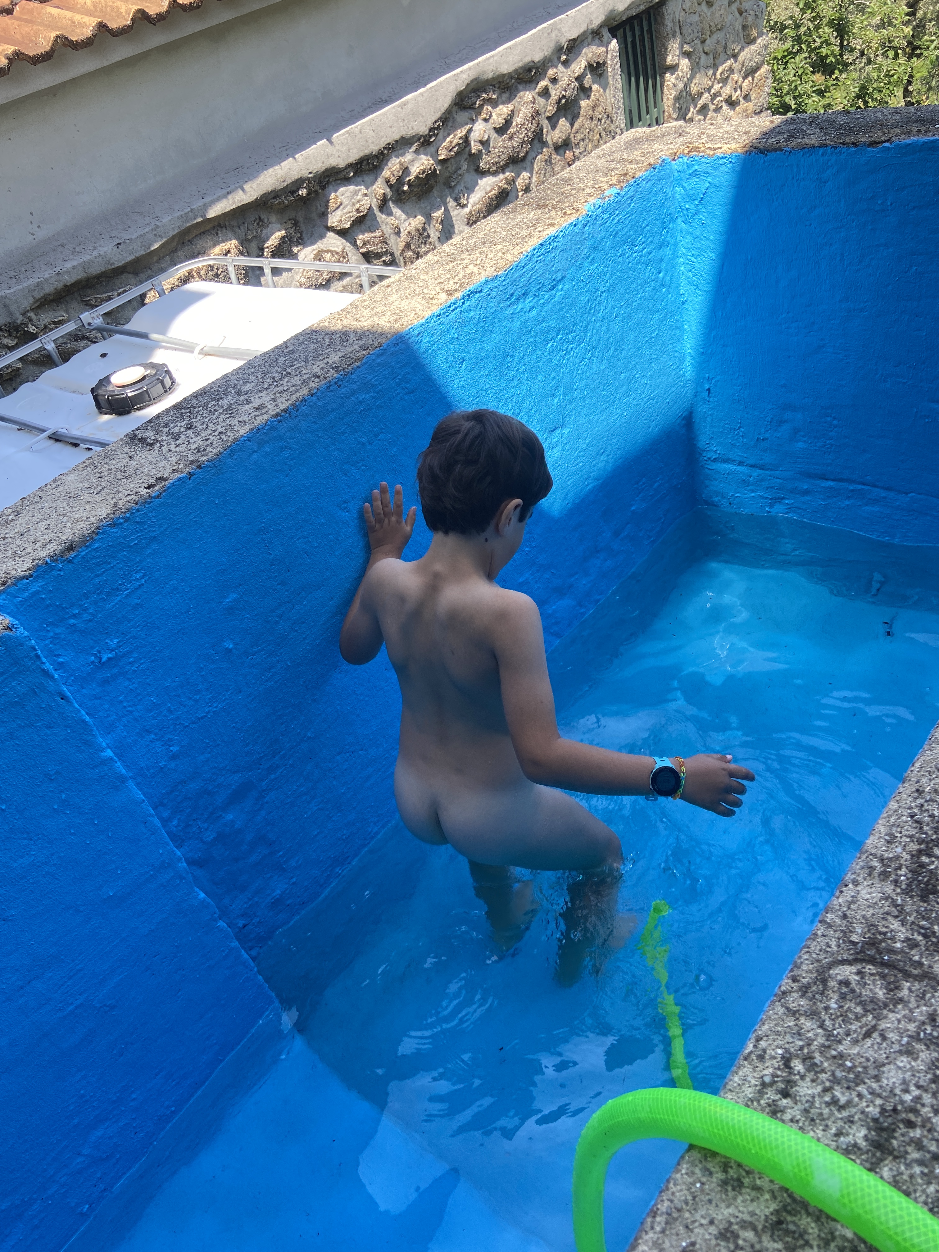 A tarefa, iniciada em meados de Abril, demoraria meses a ser concluída devido à bendita chuva que tem caído na primavera. Primeiro, tivemos de limpar e raspar o tanque todo por dentro, repleto que estava de musgo, folhas e húmus. Noutra semana, abrimos e rebocámos todas as fendas (e eram muitas) e depois ficámos a ver navios durante um mês para completar a cura do cimento e aplicar duas camadas de argamassa de impermeabilização (Weber KF). Tivemos que suportar ainda mais um mês de espera, porque entretanto choveu imenso e o tanque chegou mesmo a encher: foi preciso esperar que o tempo melhorasse e o interior secasse para aplicar duas demãos de uma tinta azul própria para piscinas (Axton). Por fim, após mais uma semana de espera recomendada pelo fabricante, abrimos as sobras do reservatório para onde desagua a água de uma das fontes naturais da Peneda (fazer chegar a água ao tanque também foi um quebra-cabeças, mas adiante).