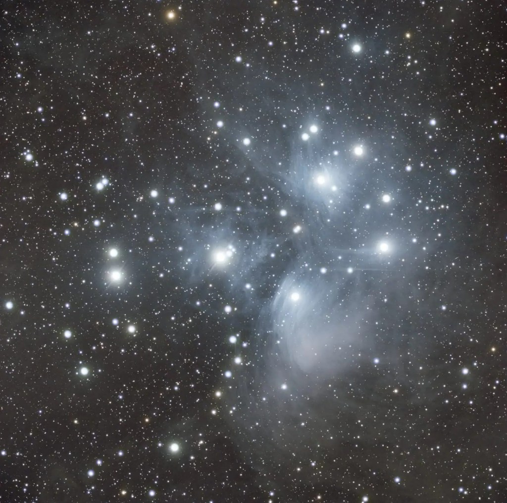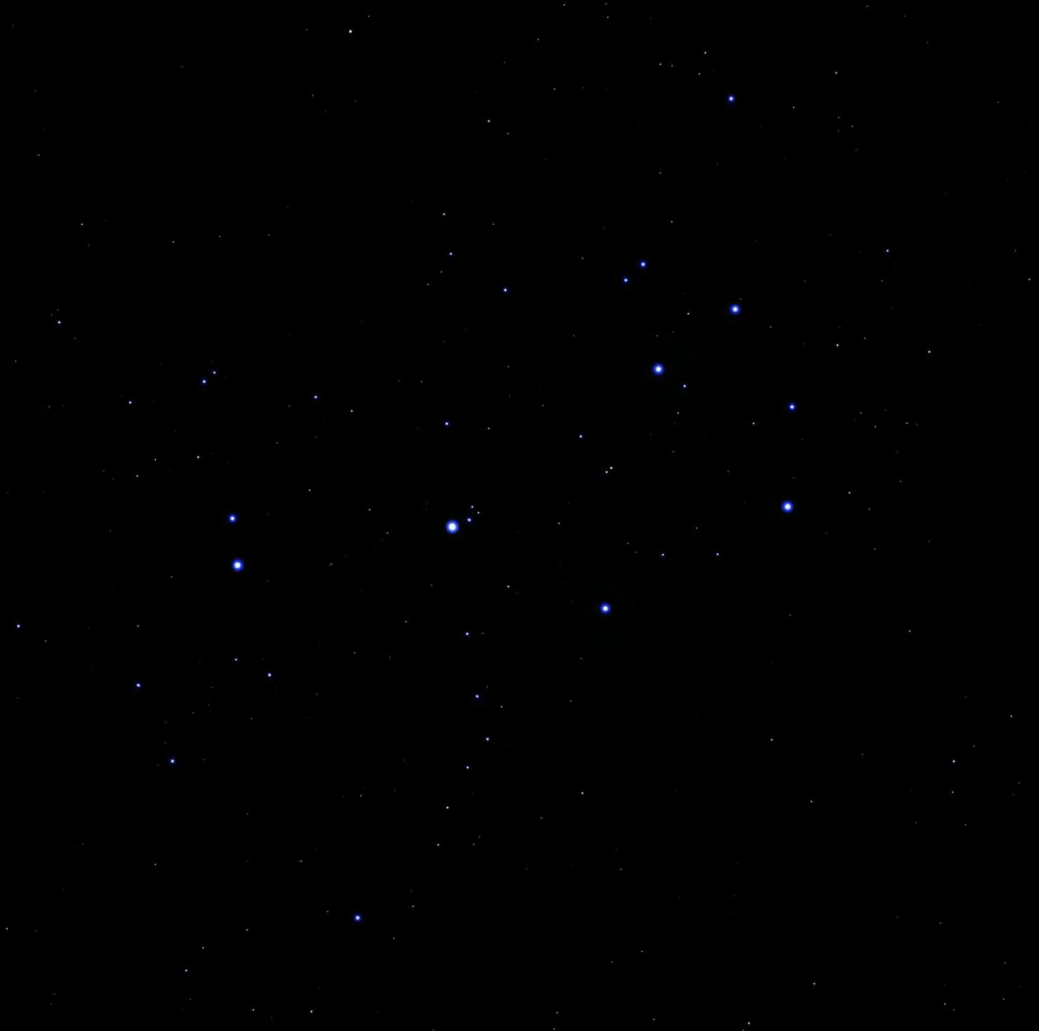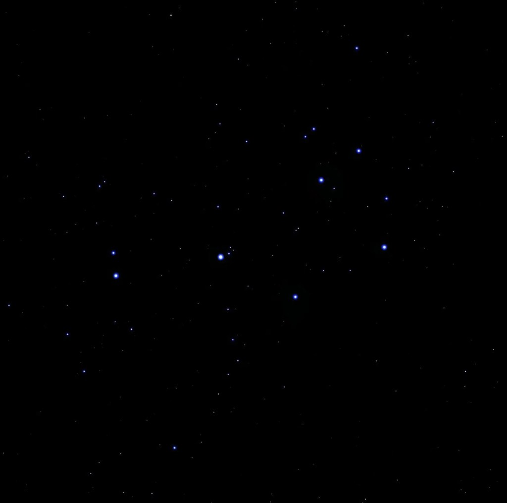 Mal o dia se pôs, acompanhámo-los a um local ermo a menos de 1km da nossa casa onde foi montado um laborioso acampamento base. Para o nosso misto de espanto e veneração, o Alcino começou a montar, conectar e afinar uma parafernália constituída por dois telescópios, duas câmaras, uma base mecânica giratória (para acompanhar a rotação da abóbada celeste), um computador portátil e uma UPS. Ao longo de 7 horas e 20 minutos, a geringonça tirou 220 fotos, cada uma com uma exposição de 2 minutos. Posteriormente, o sofisticado algoritmo de um software catita integraria esta vasta galeria de fotos no deslumbrante resultado final que encabeça esta entrada. Deixo de seguida mais duas fotos que representam etapas intermediárias da anterior, sendo a primeira a mais próxima do que se conseguia ver das Plêiades naquela noite a olho nu: