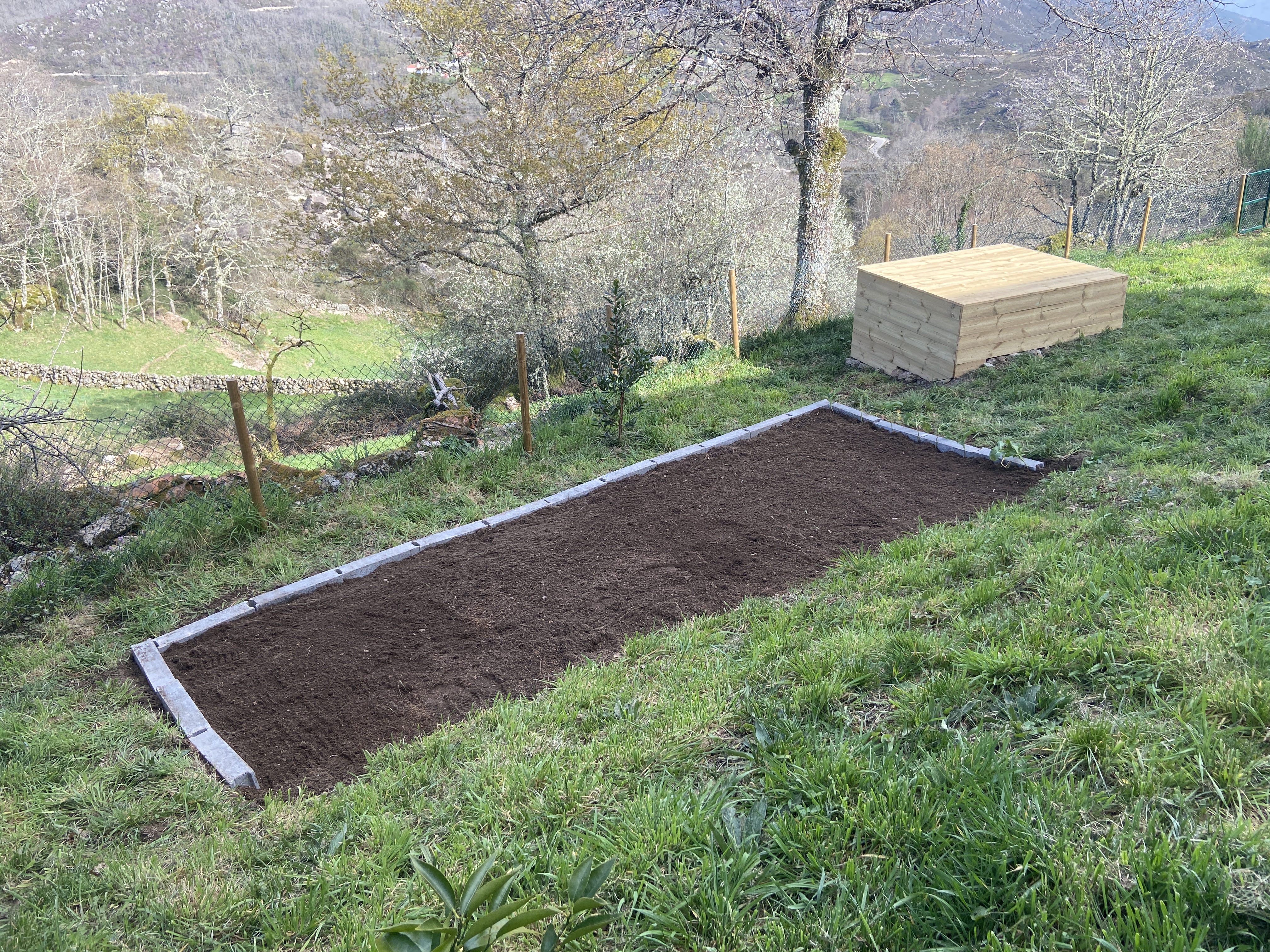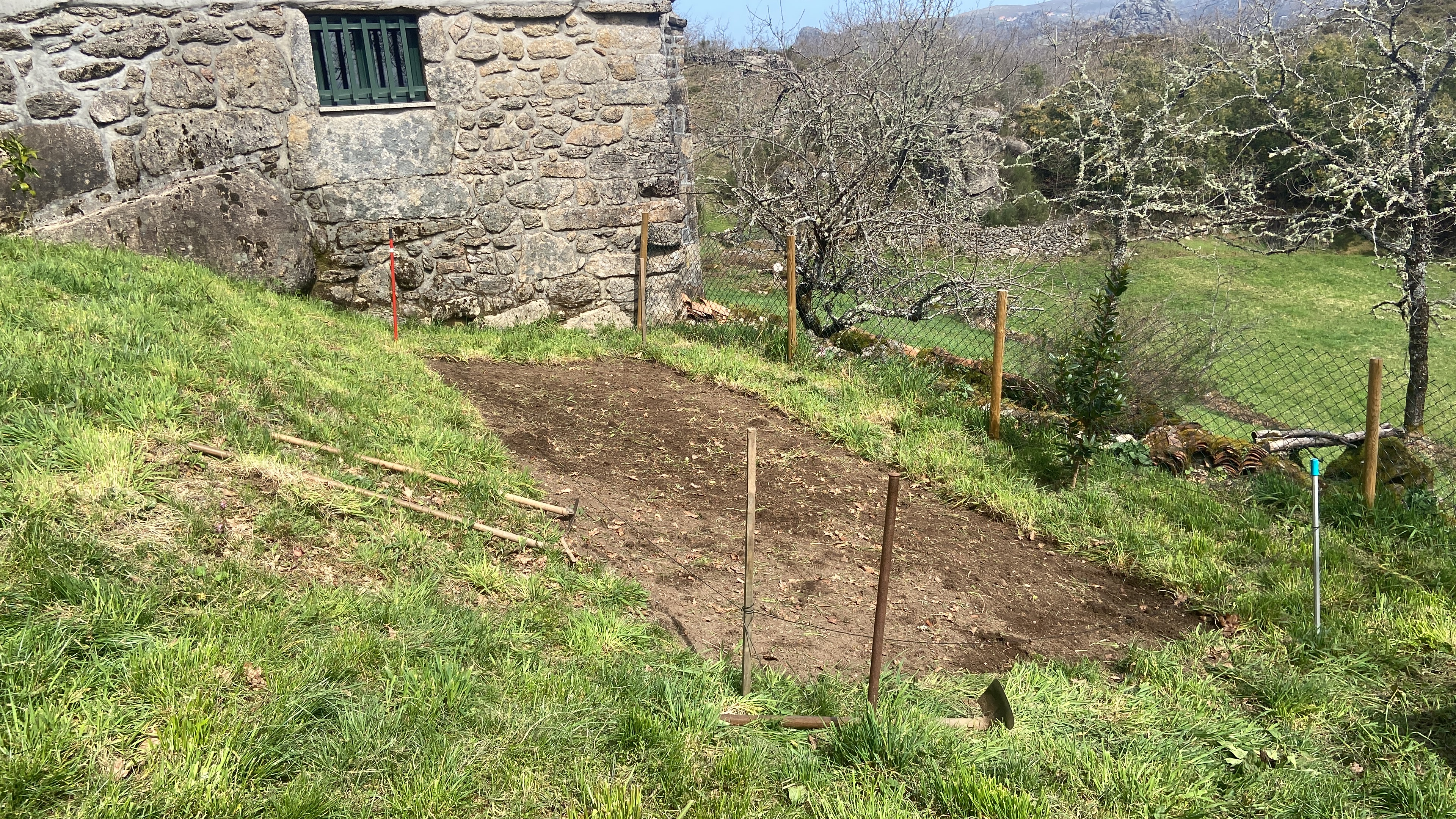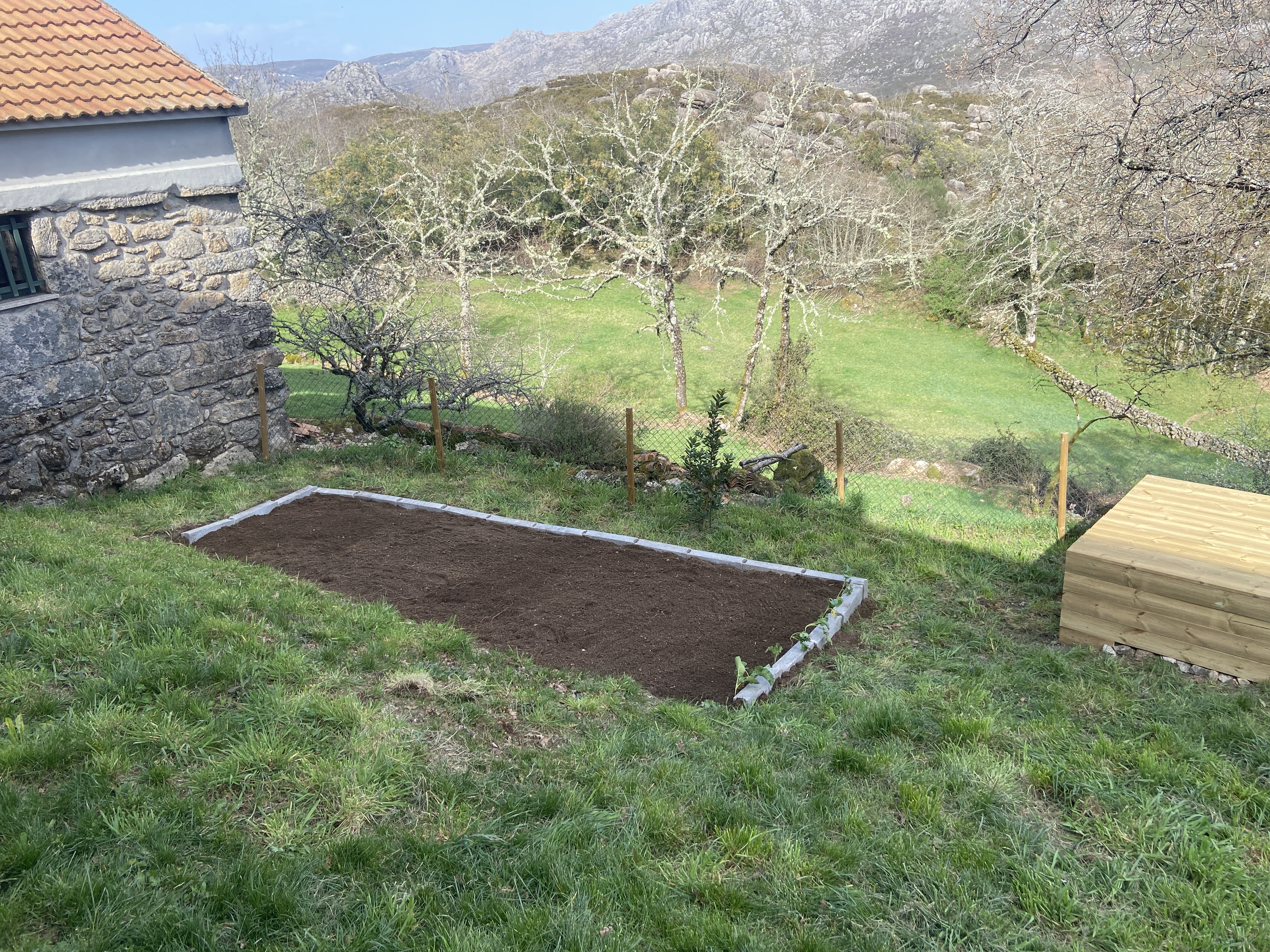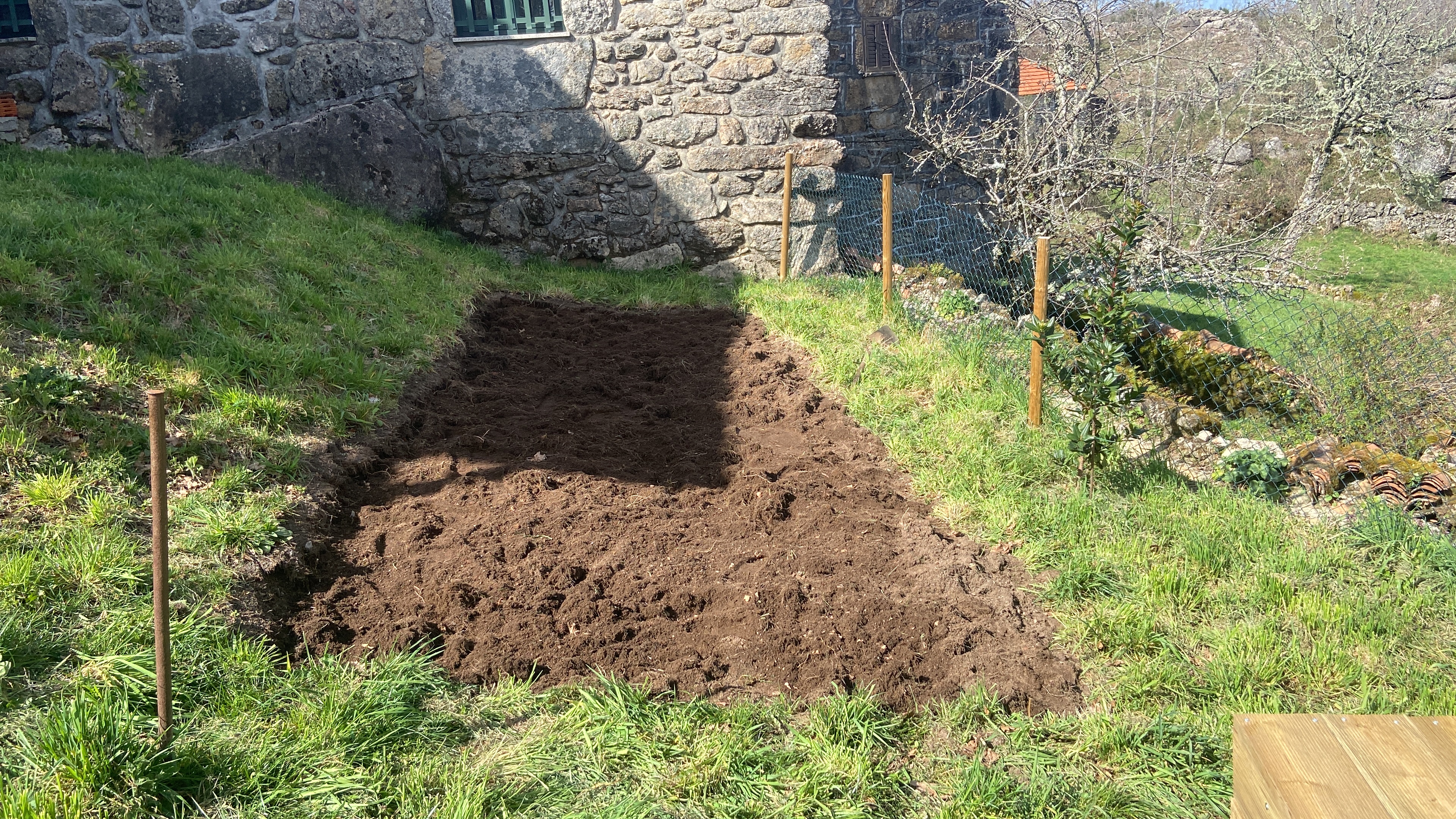 Na semana seguinte, avançámos também com mais um dos projectos que temos para esta primavera: uma pequena horta. A ideia é testar entre Abril e Outubro uma série de hortícolas que possa ser depois consumida no Verão e no Outono. Para isso, foi necessário escolher o local (protegido do Norte) e retirar a relva do local para depois cavar uma terra durinha que não era cultivada há décadas. Após retirar imensas raízes e pedras, resolvi criar com um pequeno muro de retenção com adobos de forma a diminuir ao máximo o declive do terreno. Acabou por ficar muito bem e não vejo a hora de lá plantar as primeiras novidades. Já tenho estrume de vaca prometido por parte da nossa vizinha Raquelinda e na cabeça um sistema automatizado de rega gota-a-gota. To be continued…