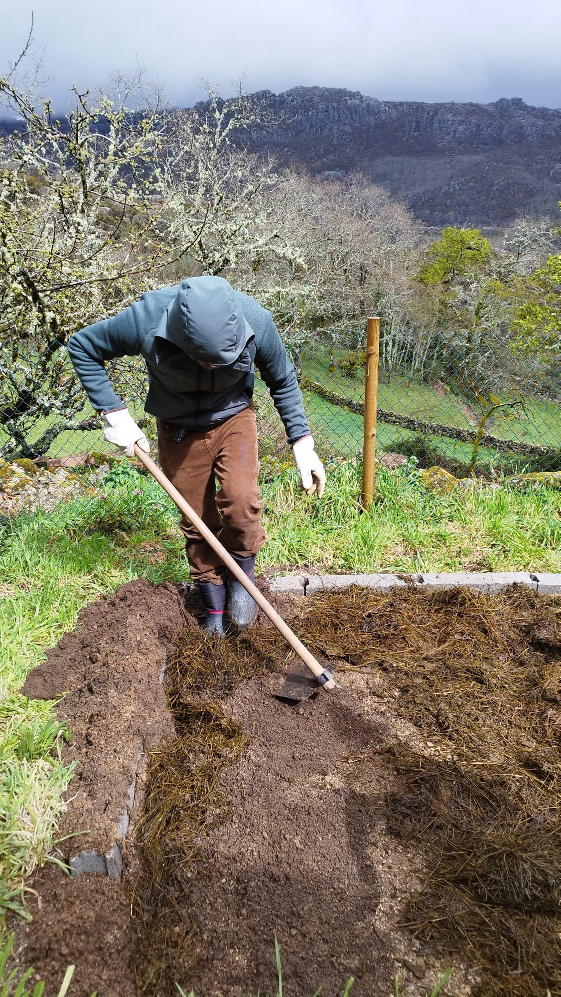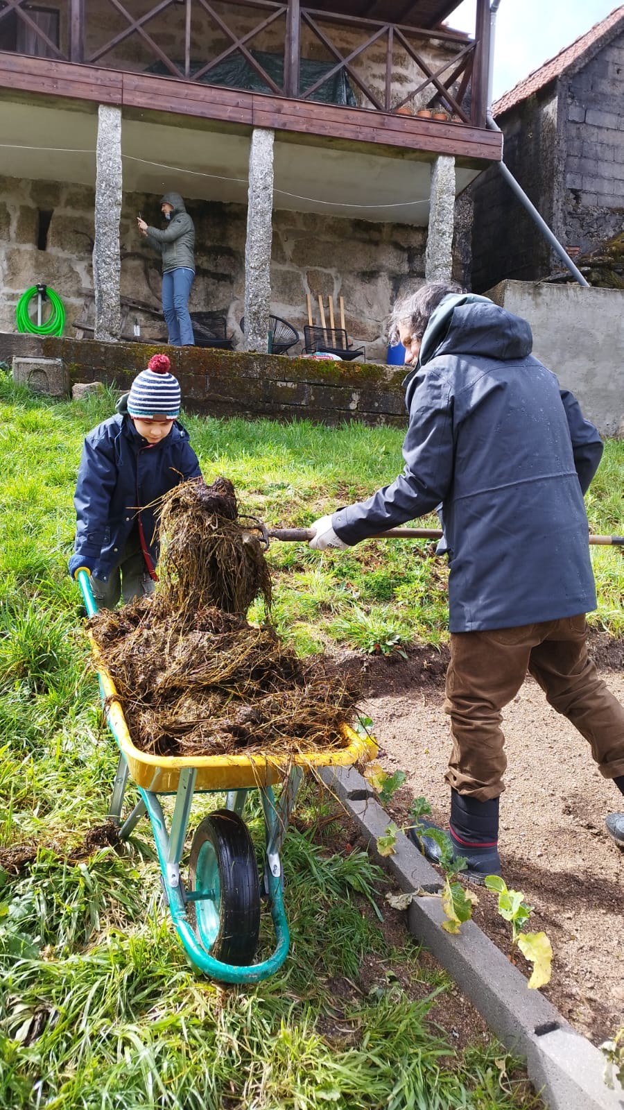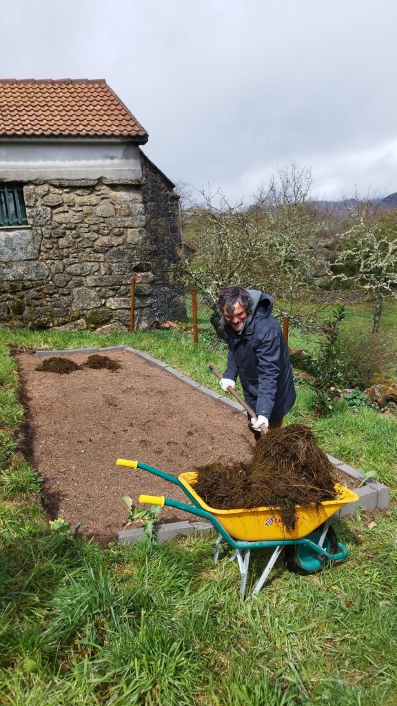 Na sexta, apesar do tempo chuvoso, atirámo-nos (com o beneplácito dos convidados) à tarefa de fertilizar a terra cavada do quintal das traseiras, tudo graças ao precioso estrume de vaca gentilmente disponibilizado pela nossa vizinha Raquelinda. Quatro carros-de-mão fumegantes que irão fazer maravilhas à terra muito empobrecida da futura horta. Nos próximos dois fins-de-semana, temos as feiras de Entrimo e Lóbios, onde esperámos encontrar muitas novidades para plantar. Há planos para vagens, cebola, alface, tomate e pepino.