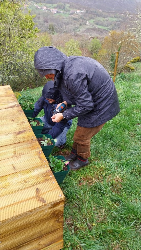 Ainda de tarde, os pequenos e respectivas mamãs transplantaram os dezasseis morangueiros que adquirimos em Miramar e Ponte de Lima, enquanto os papás aparafusavam quatro ripas nos lados Norte e Sul da nova fossa onde depois prendemos os novos vasos. A nossa esperança é que a sombra do grande carvalho das traseiras proteja as plantas do sol que sabemos poder ser impiedoso nos meses mais quentes. Havemos igualmente de instalar um sistema de rega automático semelhante ao do jardim da frente tanto para a horta como para os morangueiros. Planos não nos faltam!