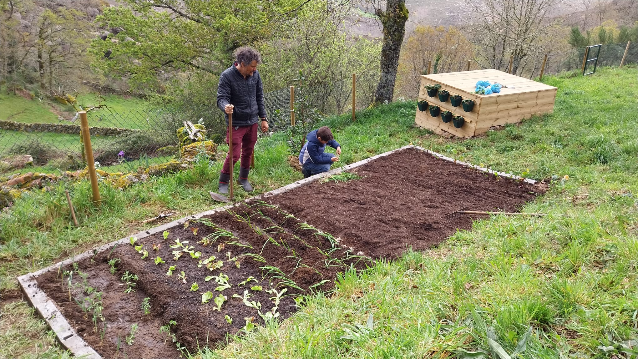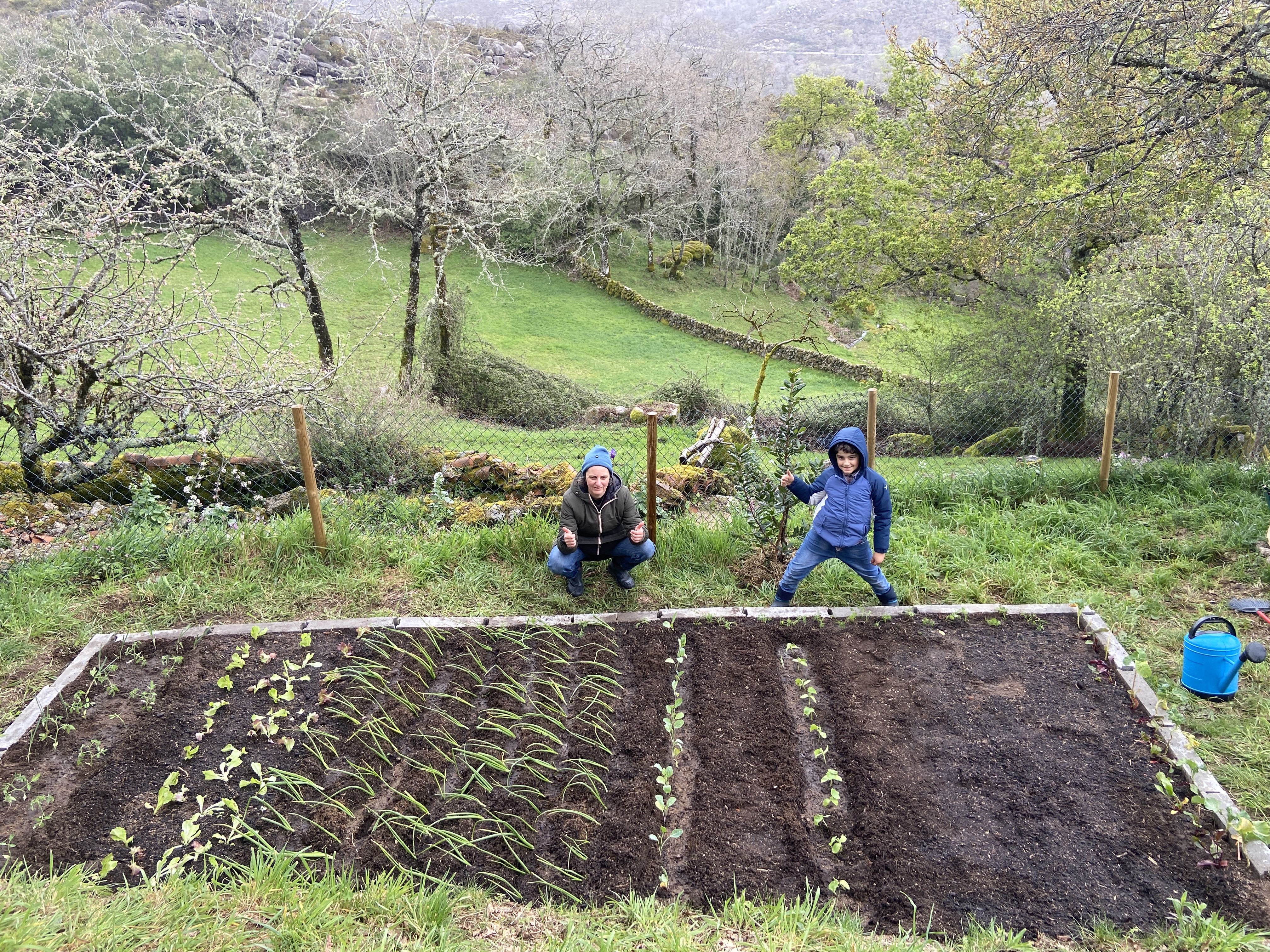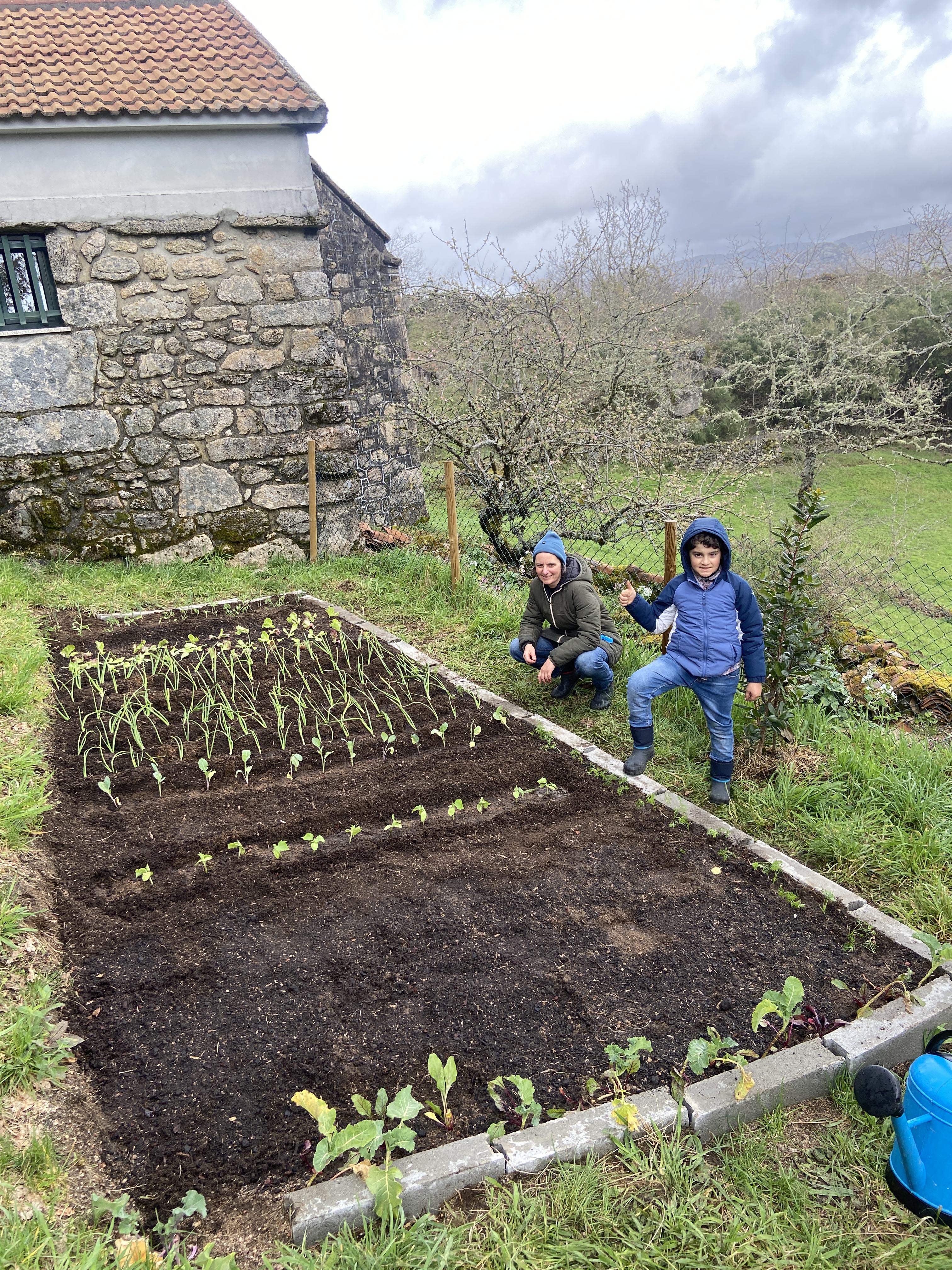 Com a terra bem estrumada, procedemos à complicada tarefa de fazer caber tudo na horta. O pequeno está cada vez mais empenhado nestas tarefas e, pessoalmente, é sempre uma fonte de prazer infindo ver toda a família a mexer na terra. No dia em que escrevo isto, está a chover em Castro, o que é óptimo para horta, mas vamos ter de instalar o sistema de rega sem falta no próximo fim-de-semana, pois as temperaturas irão começar a ultrapassar de forma regular os 20 graus.