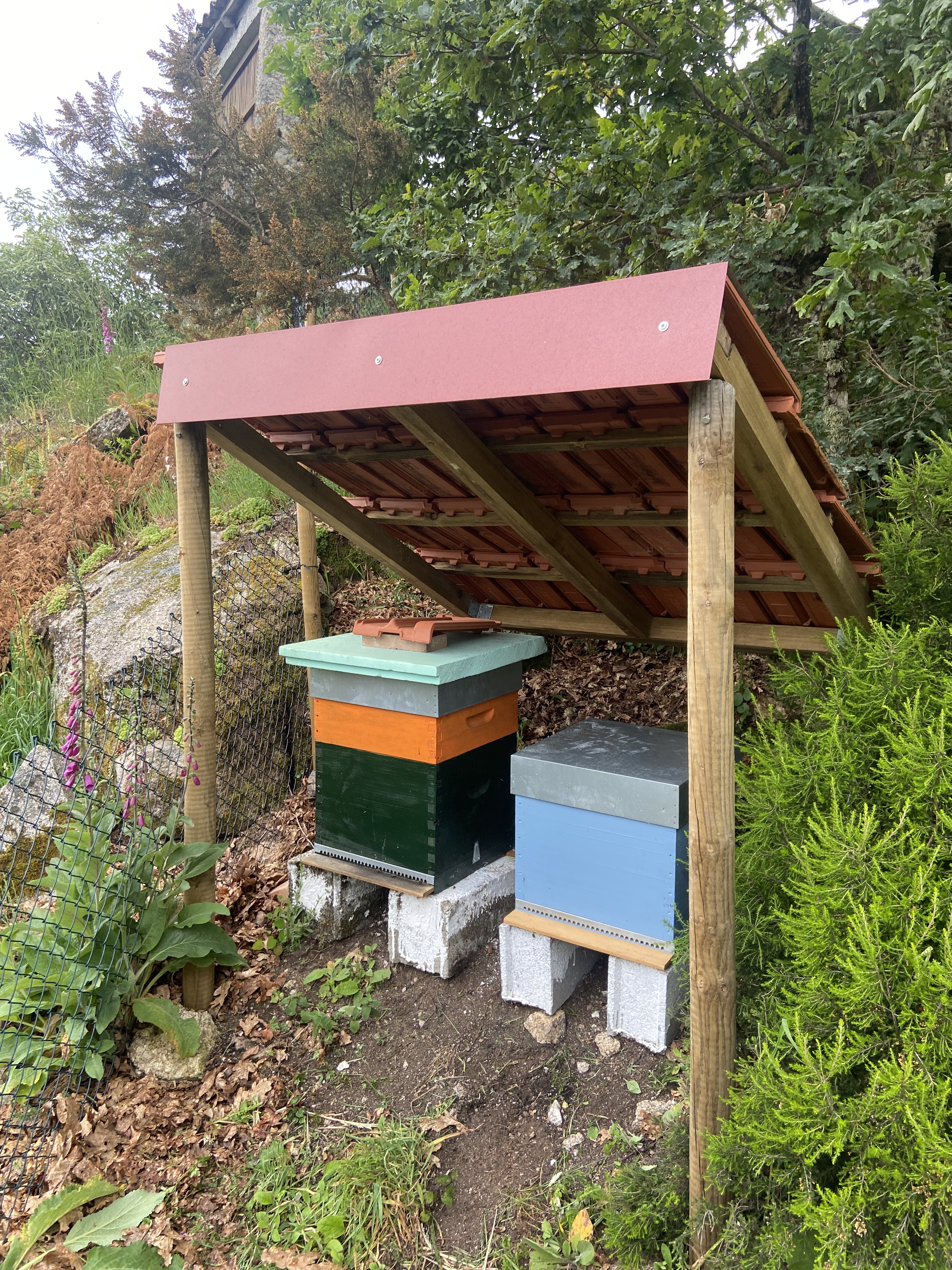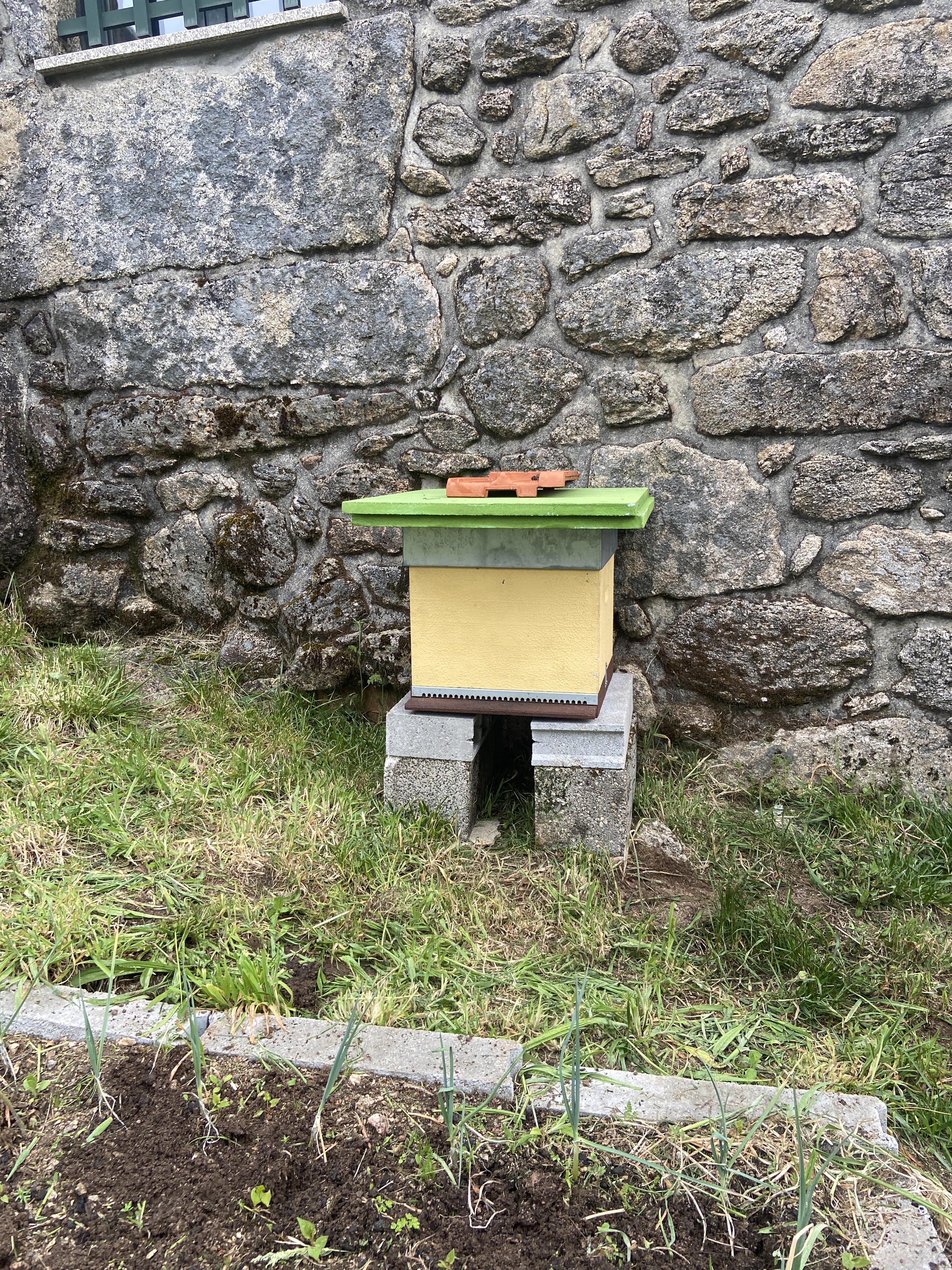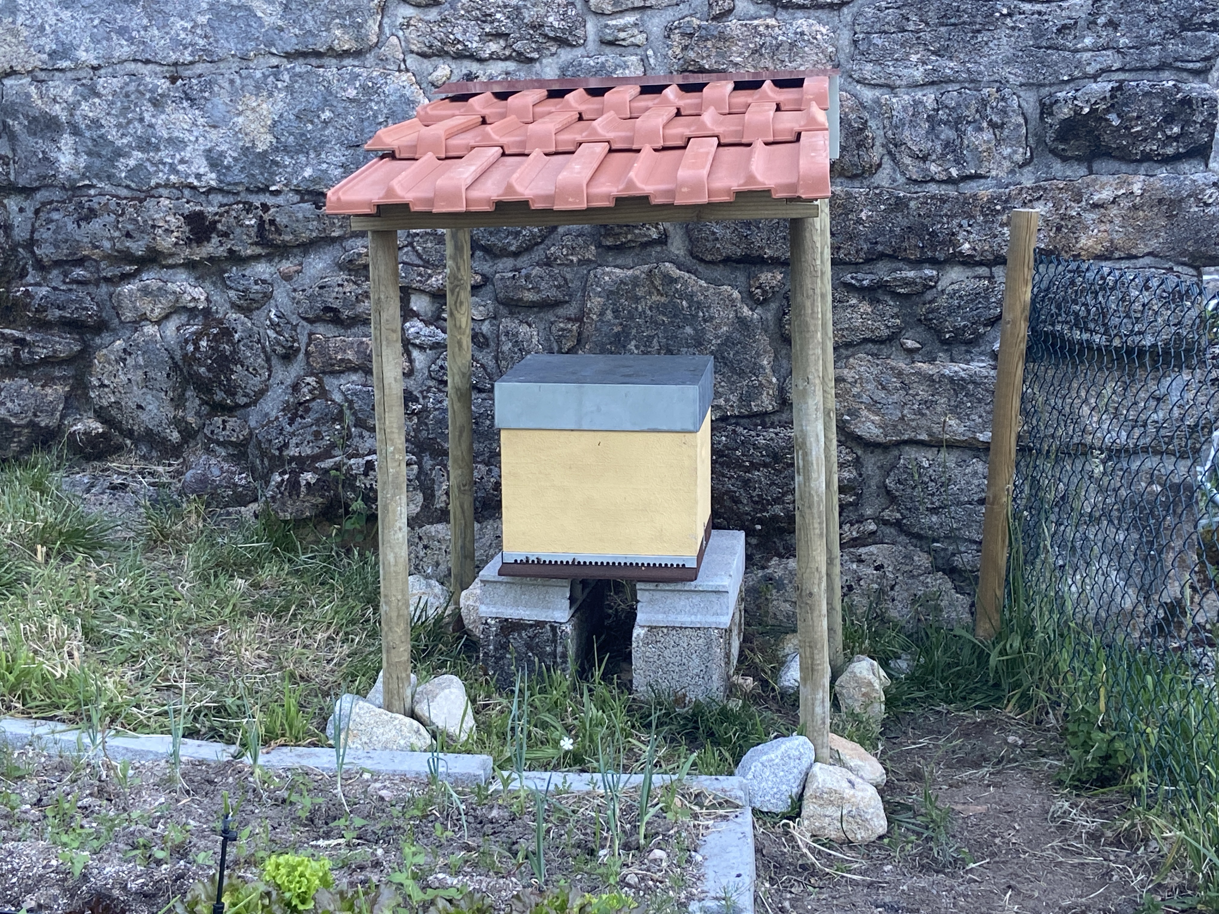 A amarela também é a que tem o maior dos novos enxames e já está em grande actividade. Ficou colocada num novo local, virada para sul e protegida do norte, mesmo ao lado da horta. Tivemos que construir um novo telheiro especialmente para ela e a sua localização tem para nós a grande vantagem de podermos ver da varanda a actividade constante das suas abelhas.