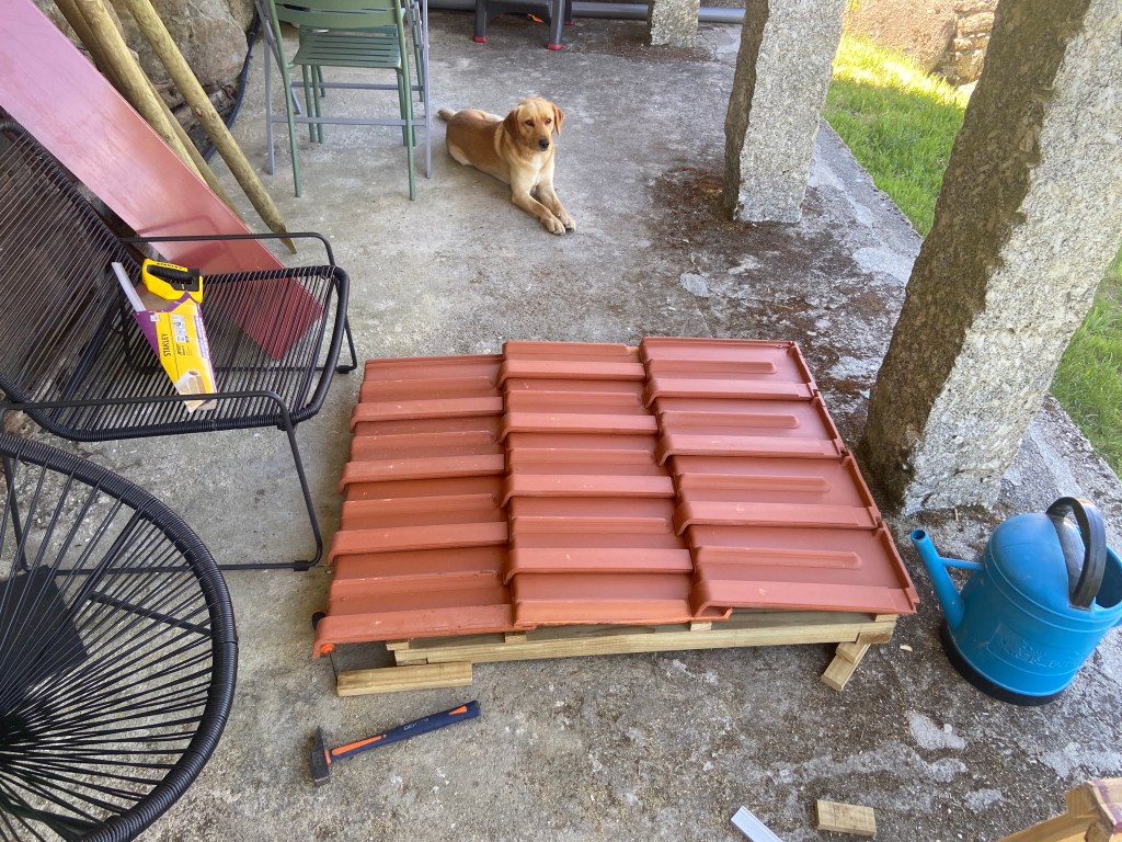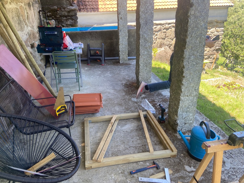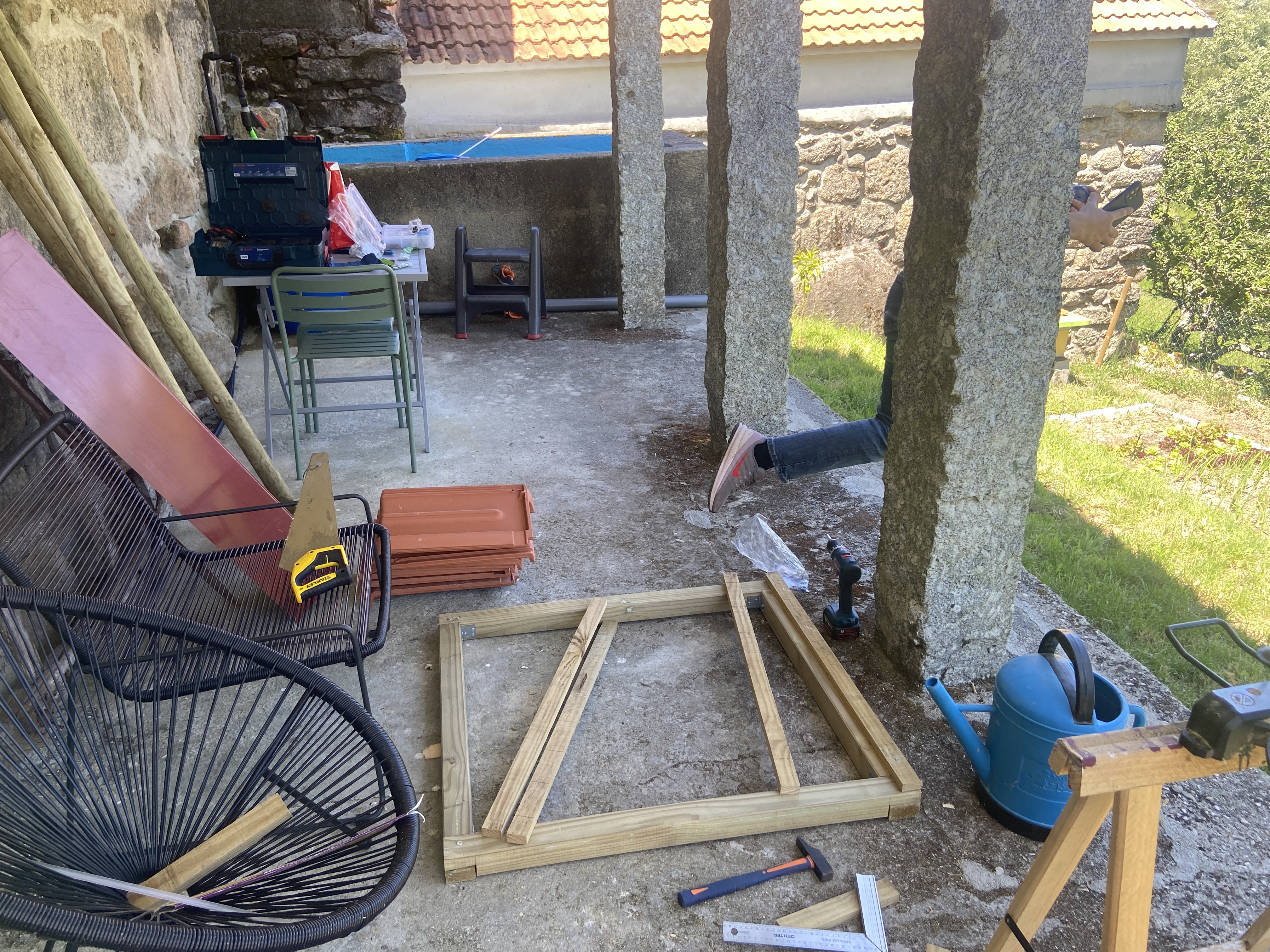 A amarela também é a que tem o maior dos novos enxames e já está em grande actividade. Ficou colocada num novo local, virada para sul e protegida do norte, mesmo ao lado da horta. Tivemos que construir um novo telheiro especialmente para ela e a sua localização tem para nós a grande vantagem de podermos ver da varanda a actividade constante das suas abelhas.