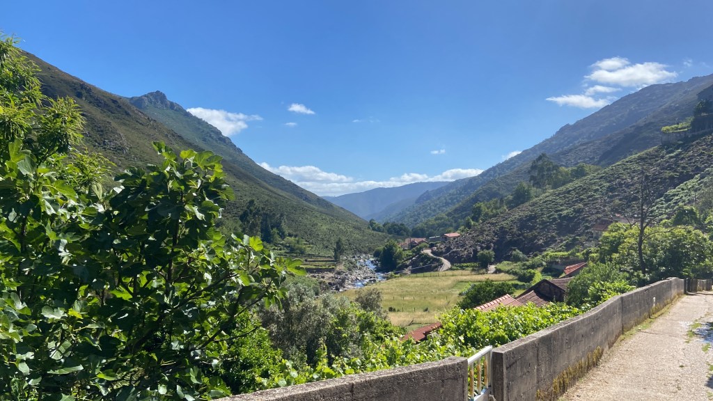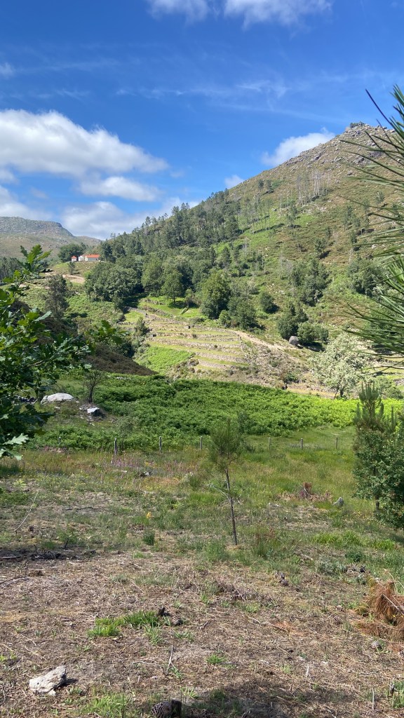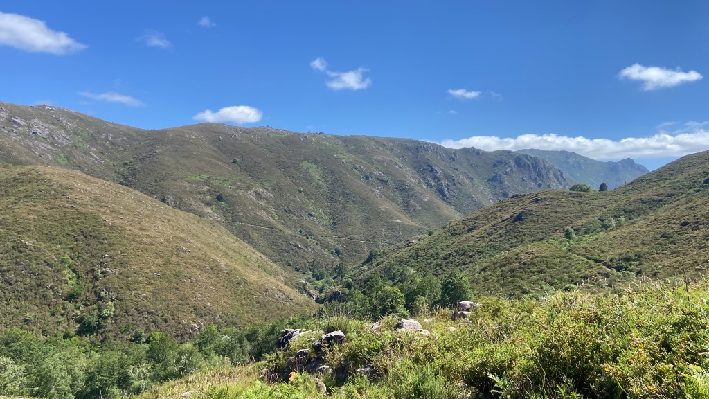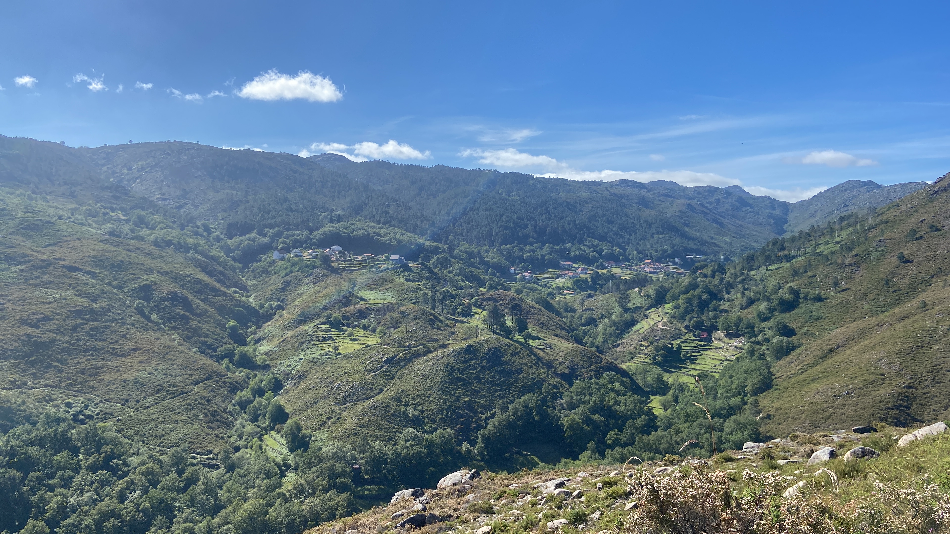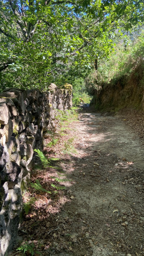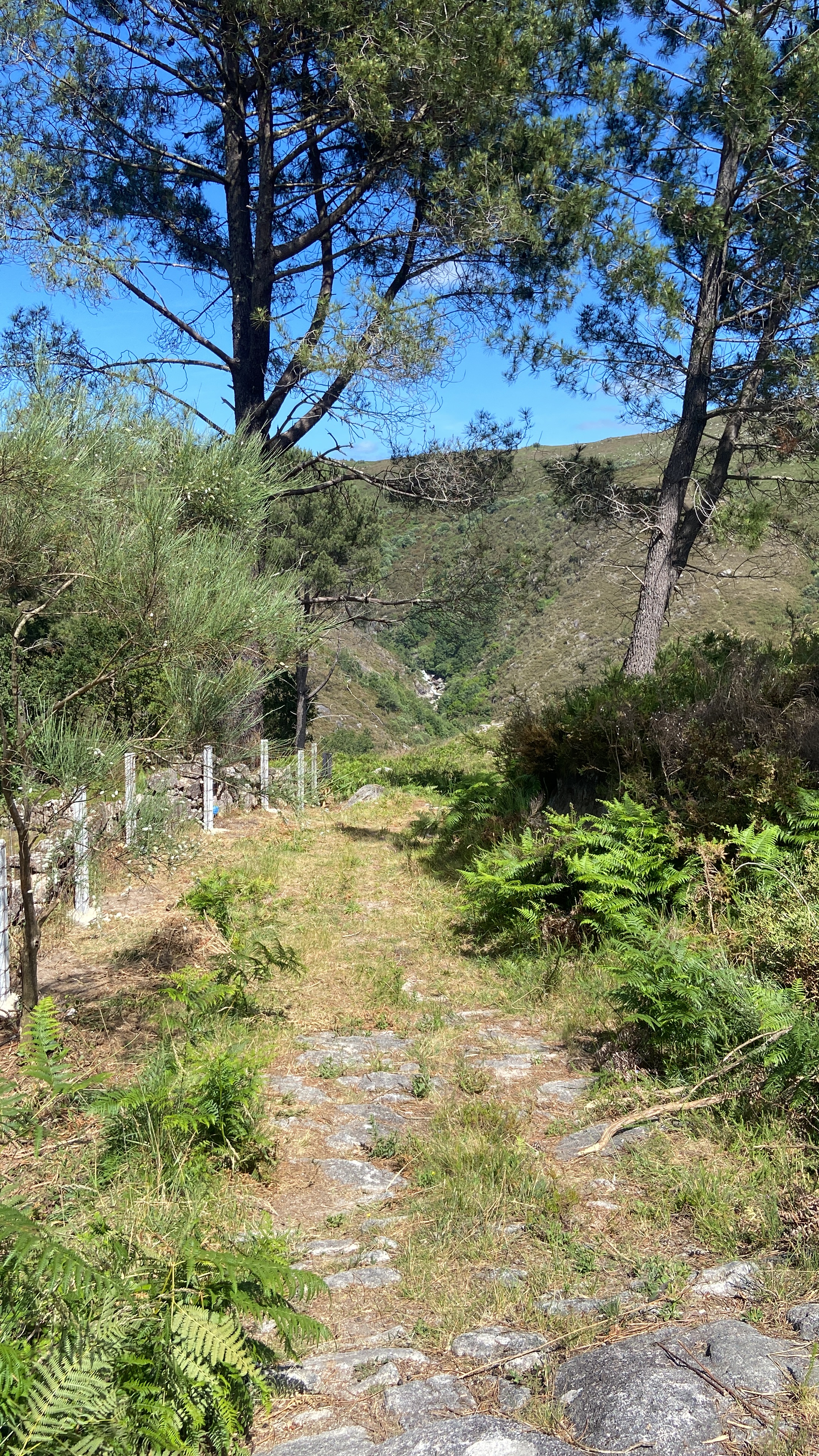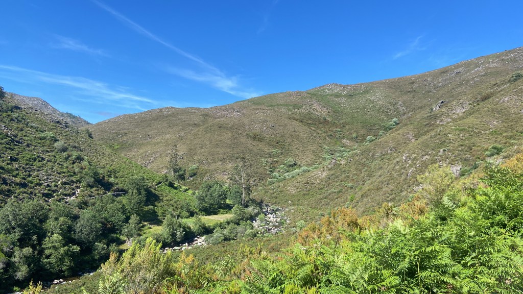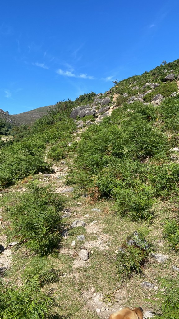 O início do percurso foi muito fácil e agradável, sempre a descer pela EM1160 da Entalada até à bela aldeia de Pousios, por onde já tínhamos passado quando fizemos, em sentido contrário, o Trilho do Curro da Velha. A partir daí, a descida continua mas o piso fica muito irregular e o caminho tem zonas com alguma vegetação alta. É então que surge em baixo o vale do Rio Laboreiro (que os galegos apodam de Barcia) e, em cima, o autêntico paredão de granito que é o Monte do Quinxo. É quando se atravessa para o lado galego em Ribeiro de Baixo que a aventura verdadeiramente começa: são mais de 3km sempre a subir até ao estradão de terra que une A Pereira à Ameijoeira. Em contrapartida, pode-se desfrutar de paisagens magníficas e de uma panorâmica única sobre todos os lugares fixos do vale ao longo da subida pela sua margem poente: é um pequeno prodígio rural feito pelo homem a tessitura de muros, caminhos e casarios que se estende pelos lugares cujos nomes parecem prometer descobertas e peripécias infindas: Ribeiro de Cima, Terços, Além, Rio de Ossos, Pousios e Ribeiro de Baixo.
