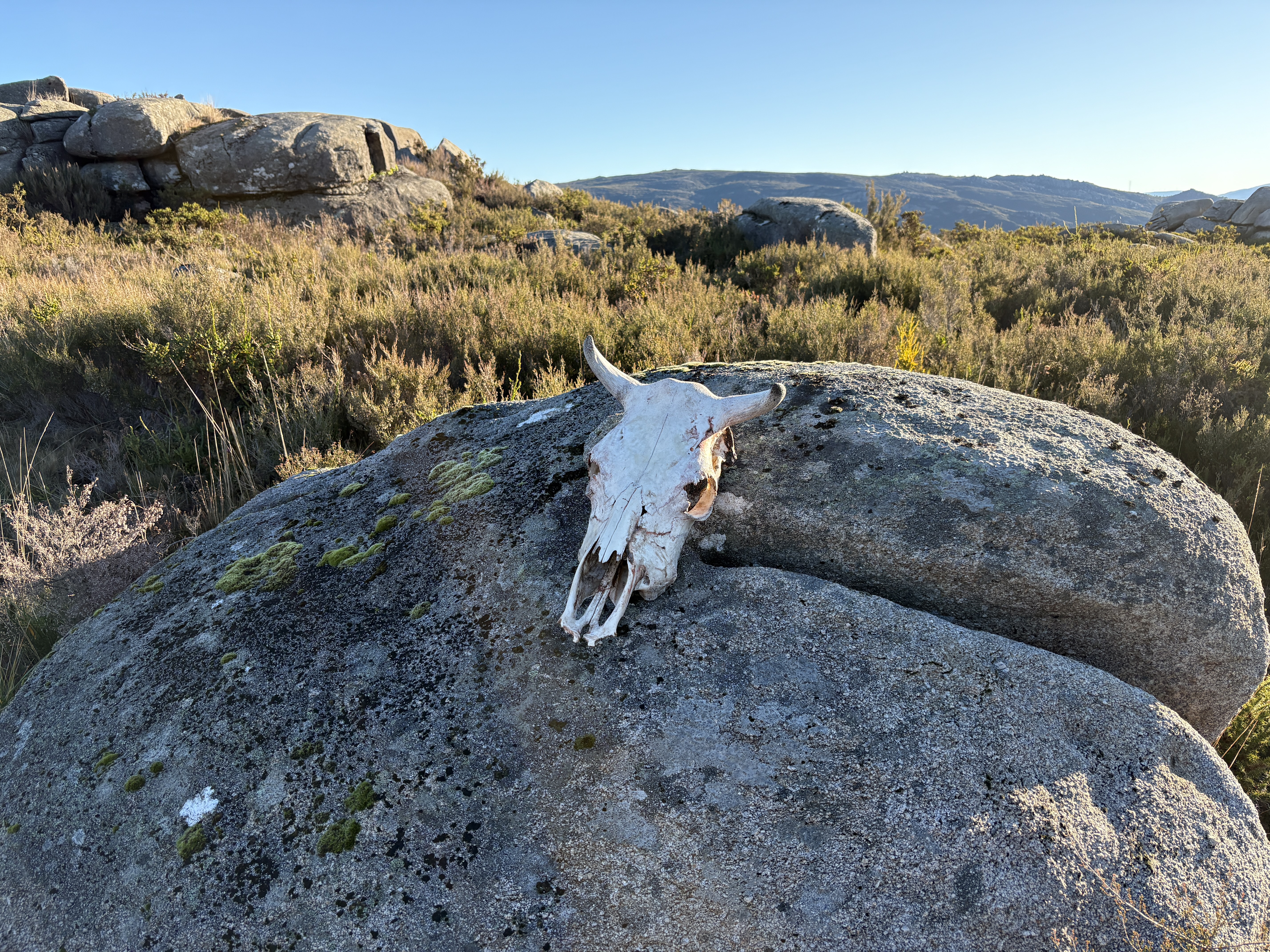(A caveira bovina foi encontrada por nós no dia de Natal a cerca de 1km da nossa aldeia. Os necrófagos abundam por estas paragens e quando uma vaca adoece e morre são necessários poucos dias para a carcaça ficar limpa.)