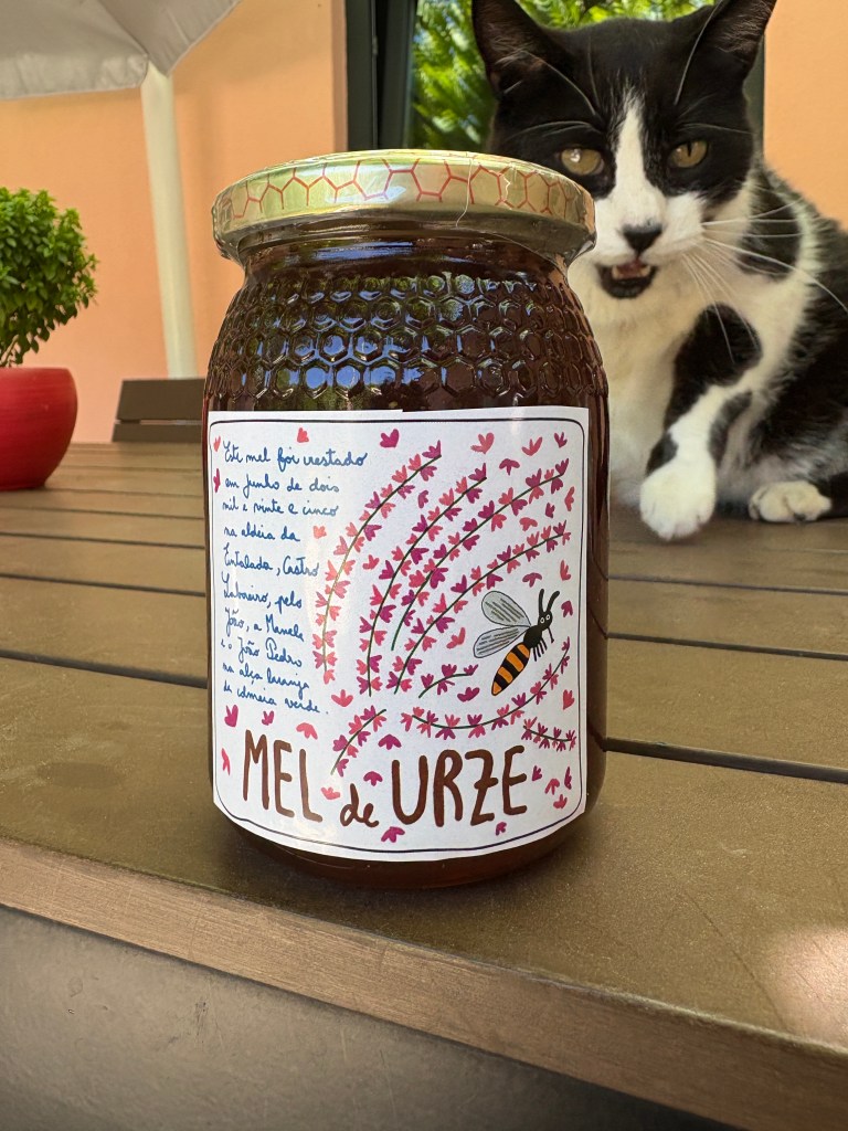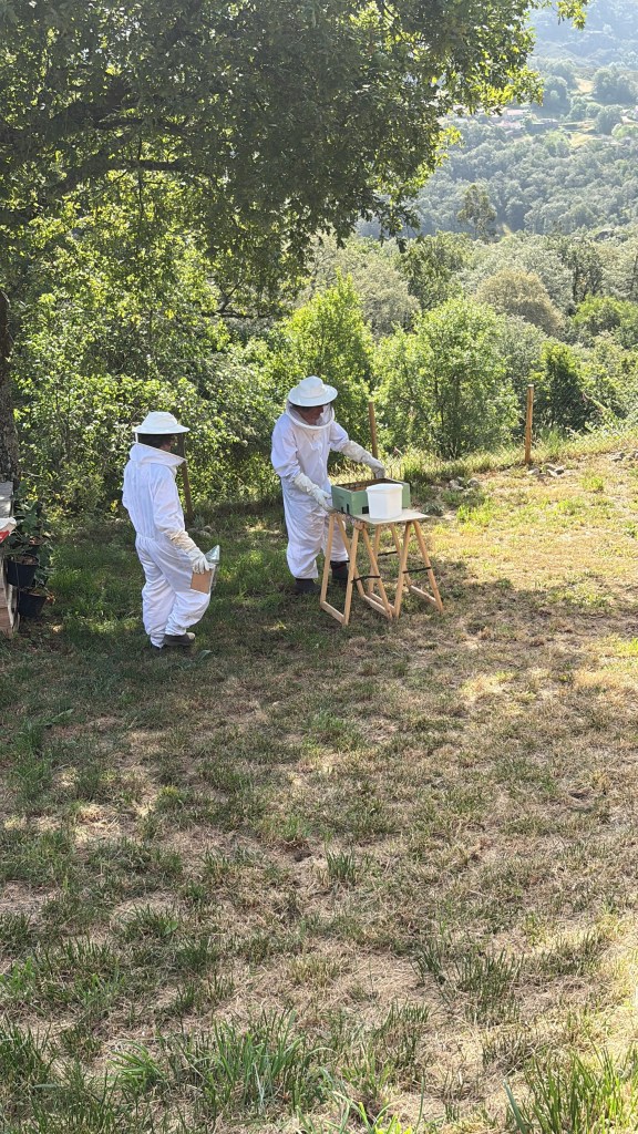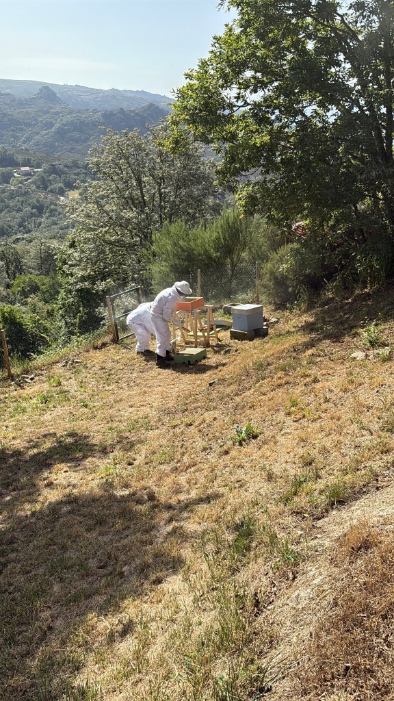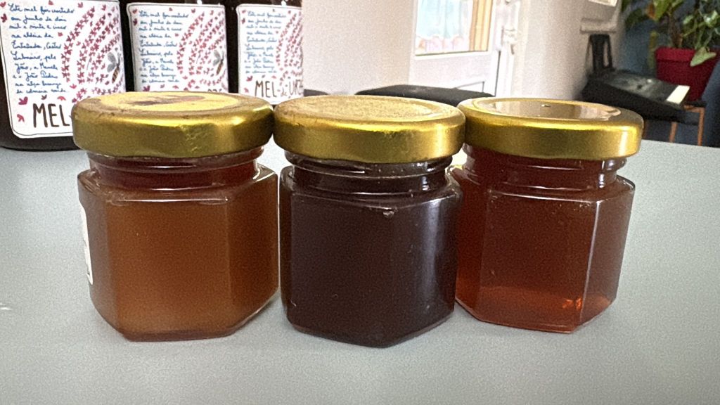 Esta já é a nossa terceira cresta e é fascinante verificar como o mel varia de cor e sabor de ano para ano, um pouco como o vinho, calculo, se bem que no caso do mel a acção do homem é praticamente nula, tudo é obra destas incansáveis obreiras. Podem ver e comparar na foto seguinte potes com o mel crestado em 2023, 2024 e 2025.