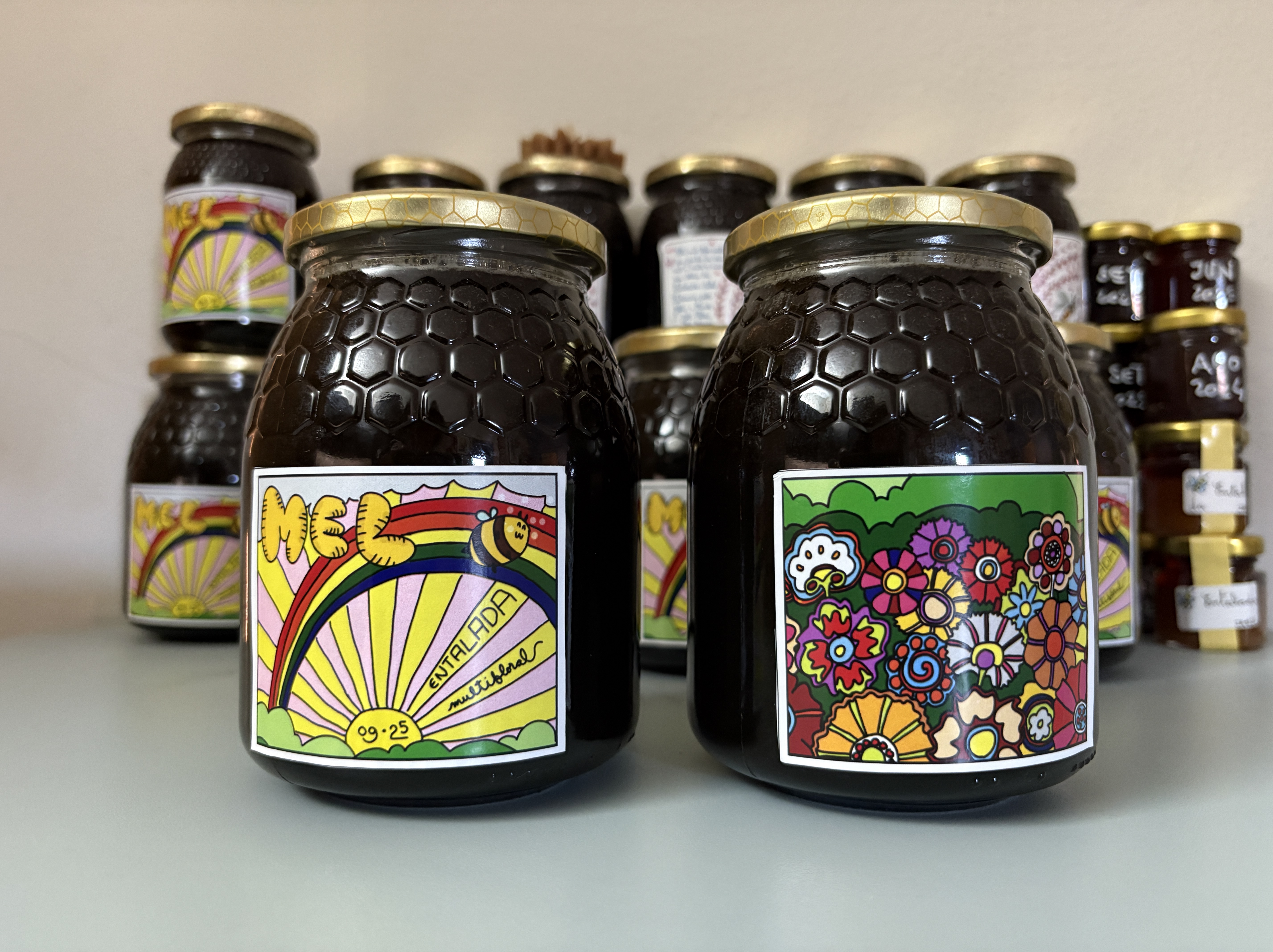 Inspirado pelo sabor meio alucinado do mel desta cresta (acho que nunca provei um mel tão doce, a sério), resolvi fazer um rótulo também ele mais complexo e psicadélico que me vi depois forçado a cortar a meio sob pena de ficar ininteligível e ficámos assim com um rótulo para a frente e outro para o verso dos frascos.