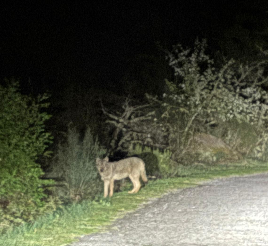 Na passada sexta-feira, no entanto, aconteceu. Tínhamos ido a Virtelo no final da tarde buscar a nossa colmeia com um novo enxame, quando, no regresso pela EM1160, a cerca de 2 km de casa, a Manela chama a nossa atenção para um par de olhos a reflectir a luz dos faróis. Abrandei, pedi logo por instinto ao filhote para se munir do telemóvel e…
